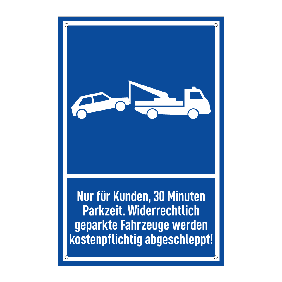 Nur für Kunden, 30 Minuten Parkzeit. Widerrechtlich geparkte Fahrzeuge werden kostenpflichtig abgeschleppt!
