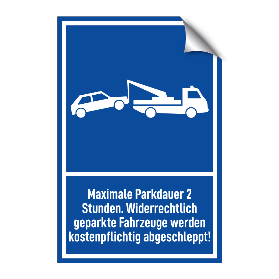 Maximale Parkdauer 2 Stunden. Widerrechtlich geparkte Fahrzeuge werden kostenpflichtig abgeschleppt!