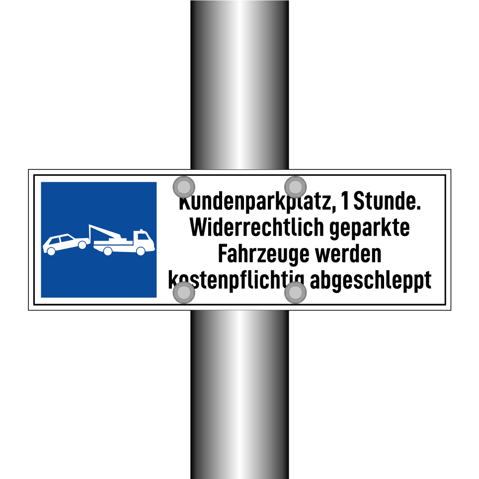 Kundenparkplatz, 1 Stunde. Widerrechtlich geparkte Fahrzeuge werden kostenpflichtig abgeschleppt