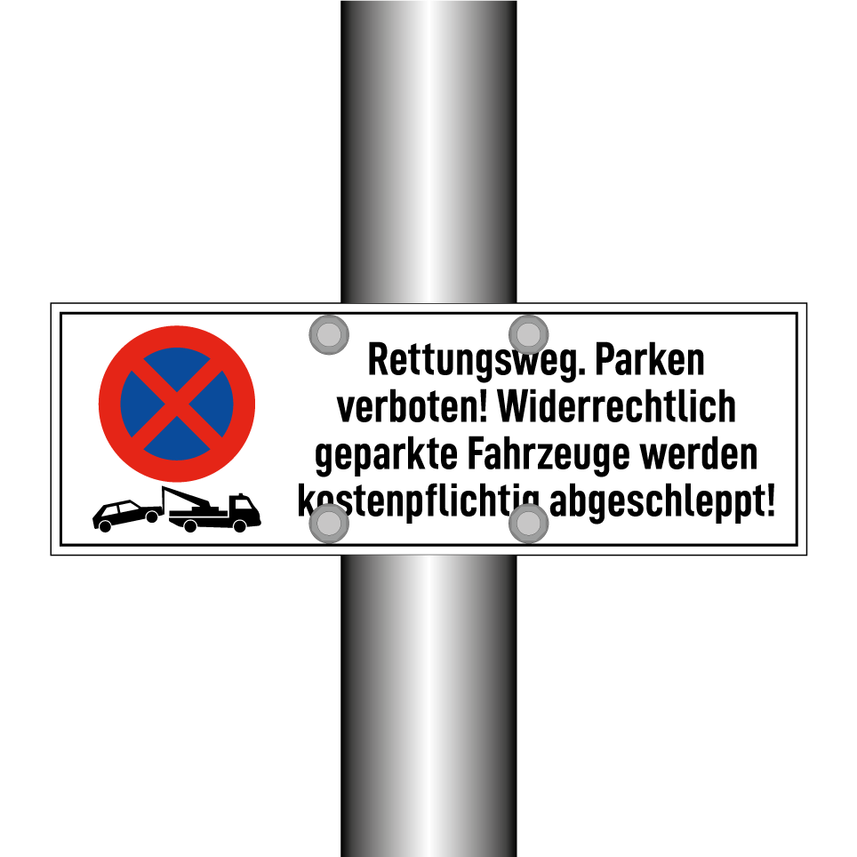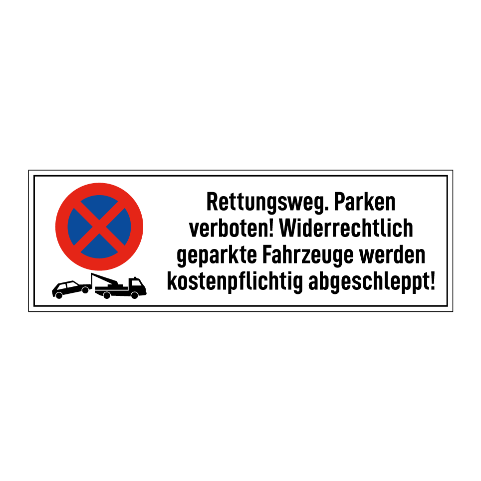 Rettungsweg. Parken verboten! Widerrechtlich geparkte Fahrzeuge werden kostenpflichtig abgeschleppt!
