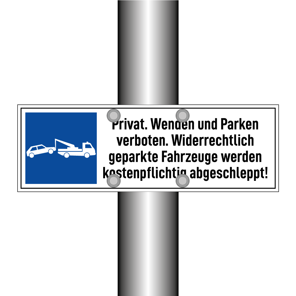 Privat. Wenden und Parken verboten. Widerrechtlich geparkte Fahrzeuge werden kostenpflichtig abgeschleppt!