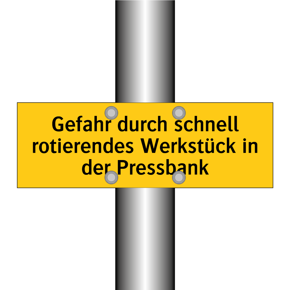 Warnschild mit dem Text Gefahr durch schnell rotierendes Werkstück in der Pressbank