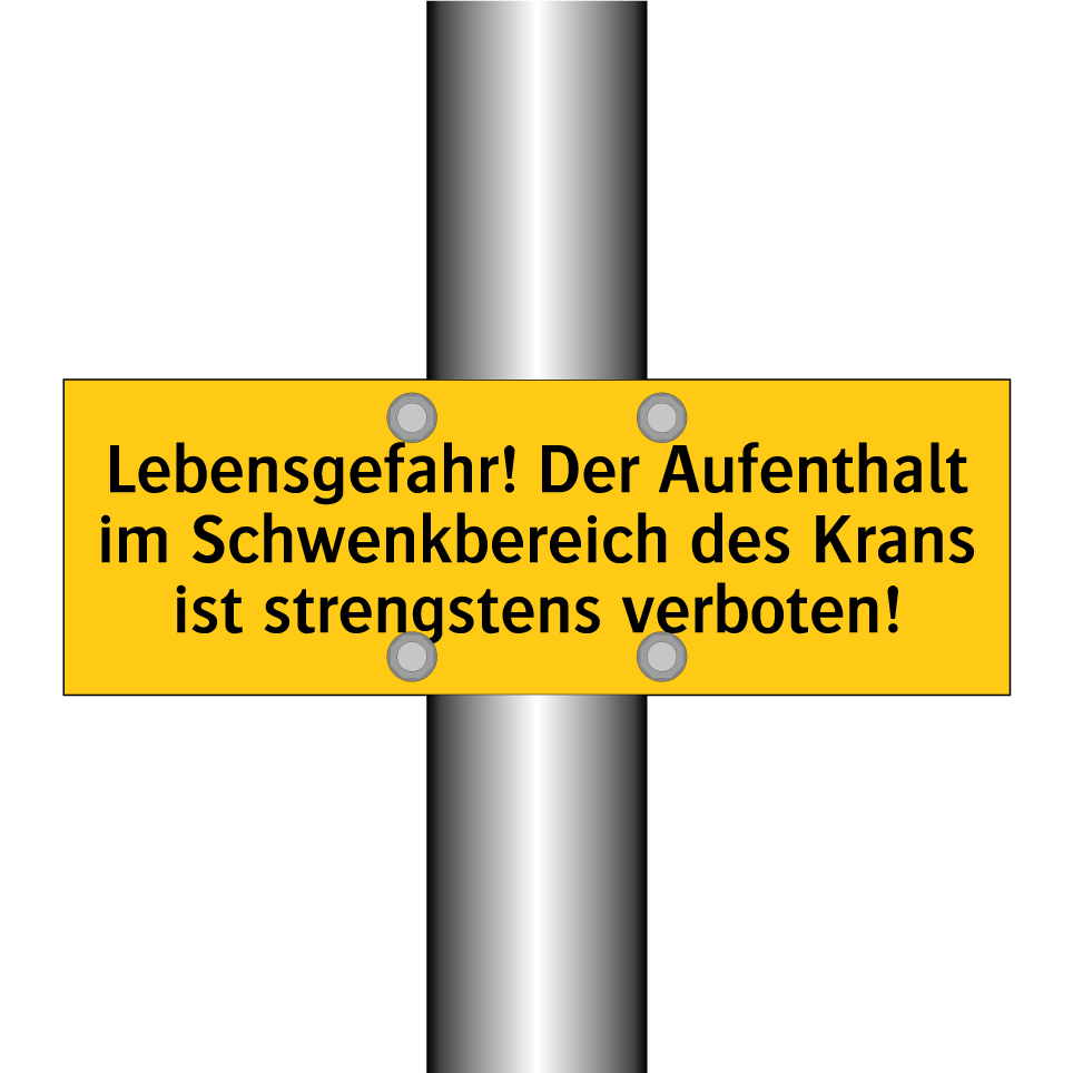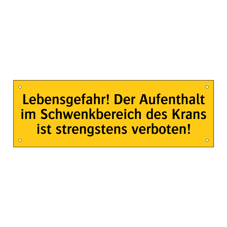 Warnschild mit dem Text Lebensgefahr! Der Aufenthalt im Schwenkbereich des Krans ist strengstens verboten!