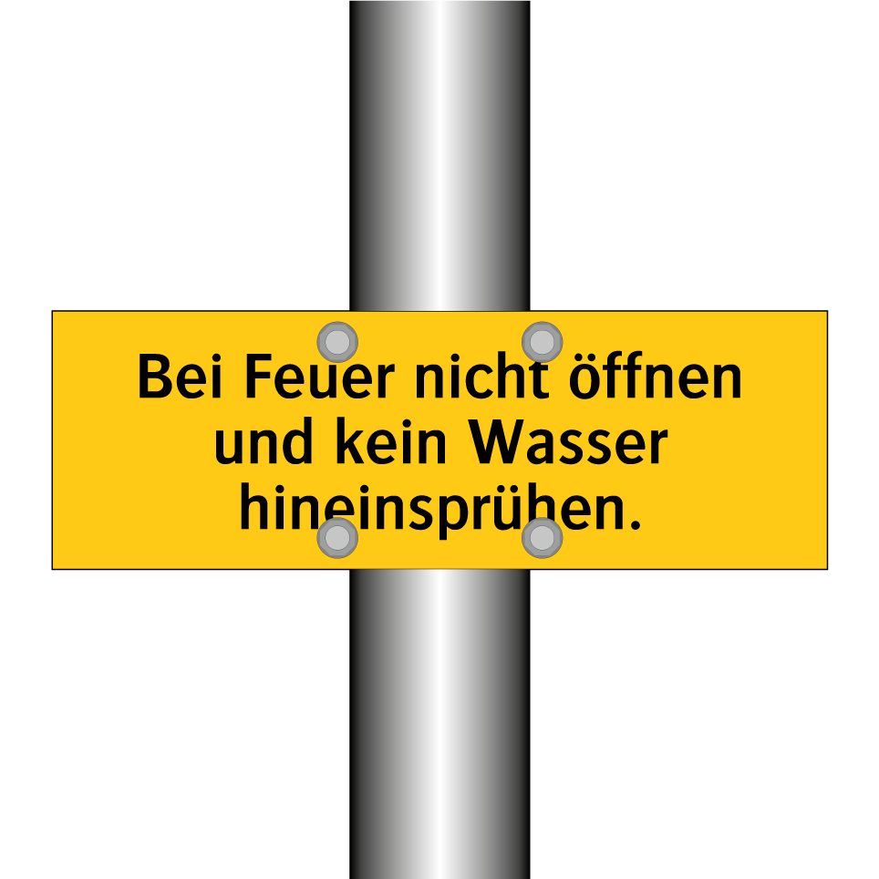 Warnschild mit dem Text Bei Feuer nicht öffnen und kein Wasser hineinsprühen.