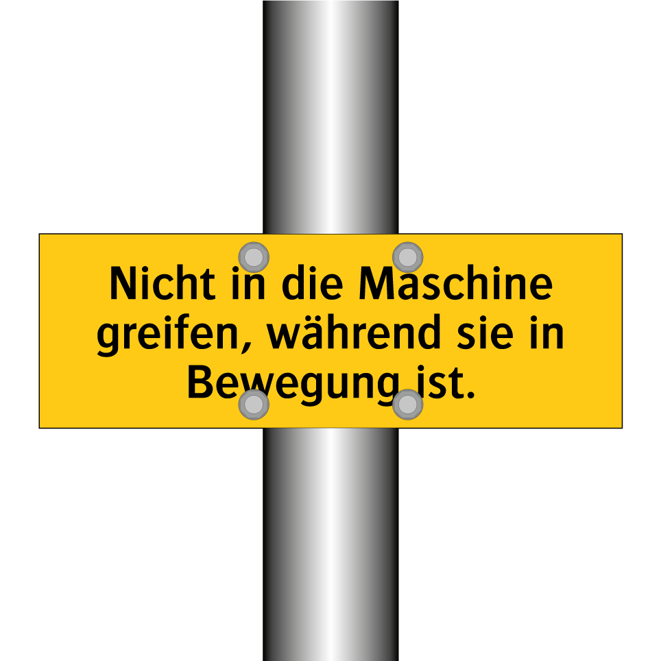 Warnschild mit dem Text Nicht in die Maschine greifen, während sie in Bewegung ist.