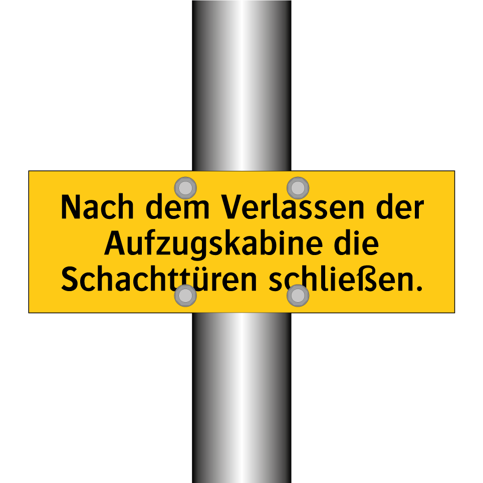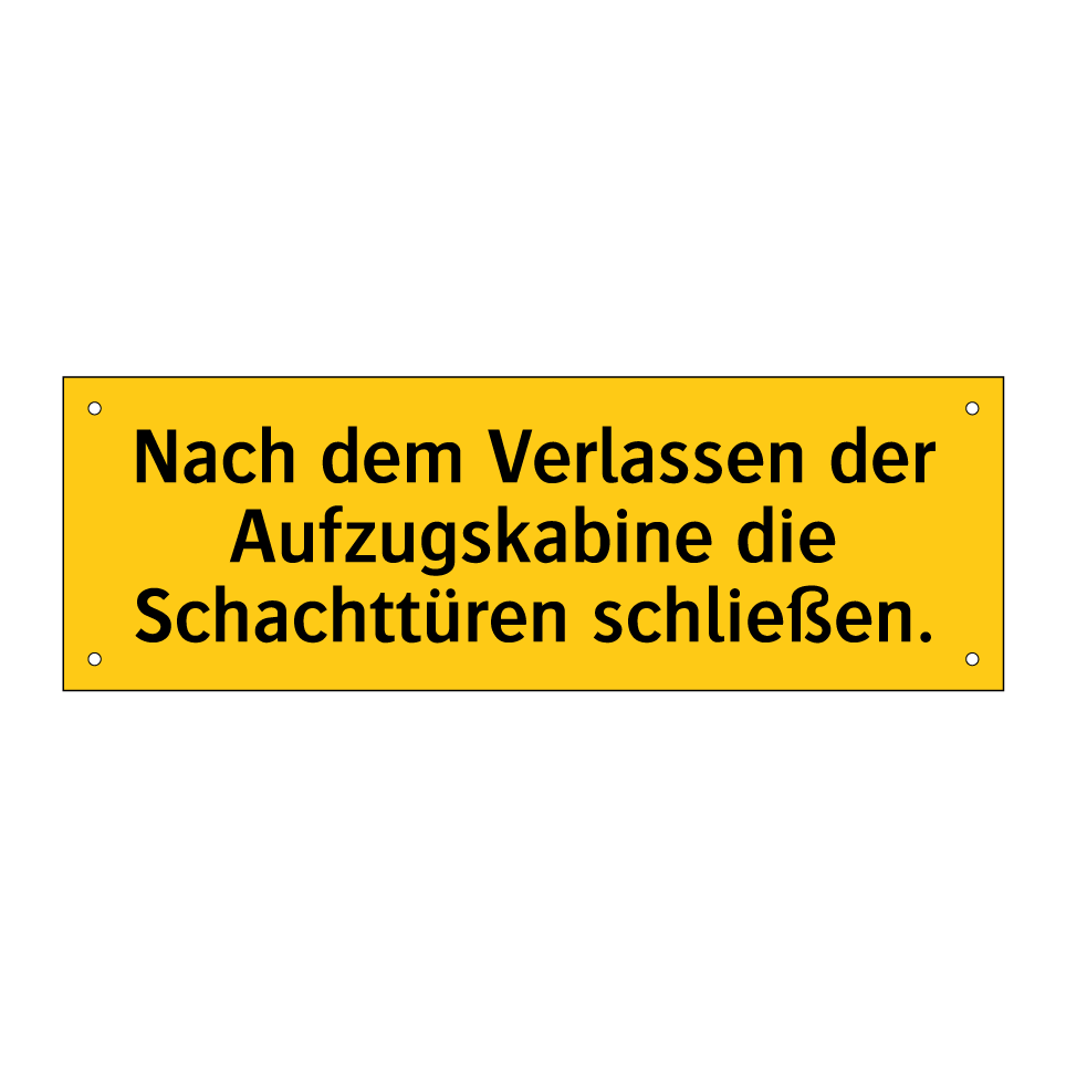 Warnschild mit dem Text Nach dem Verlassen der Aufzugskabine die Schachttüren schließen.
