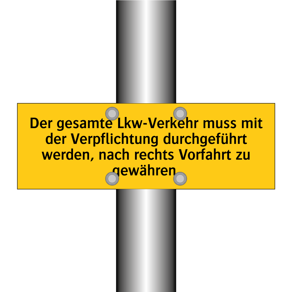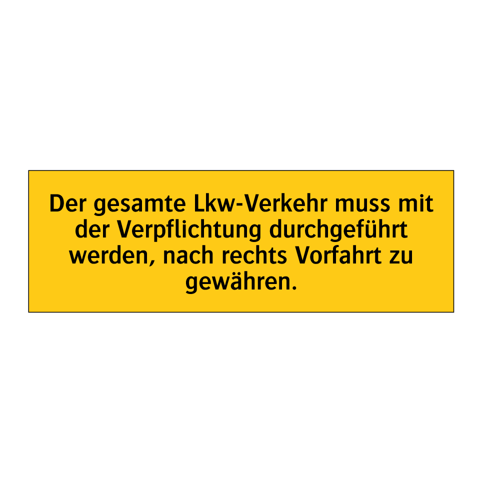 Warnschild mit dem Text Der gesamte Lkw-Verkehr muss mit der Verpflichtung durchgeführt werden, nach rechts Vorfahrt zu gewähren.