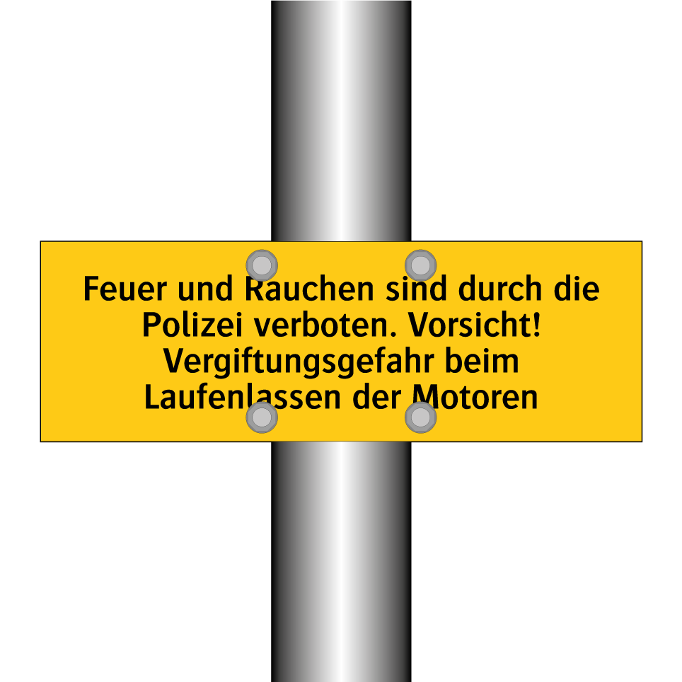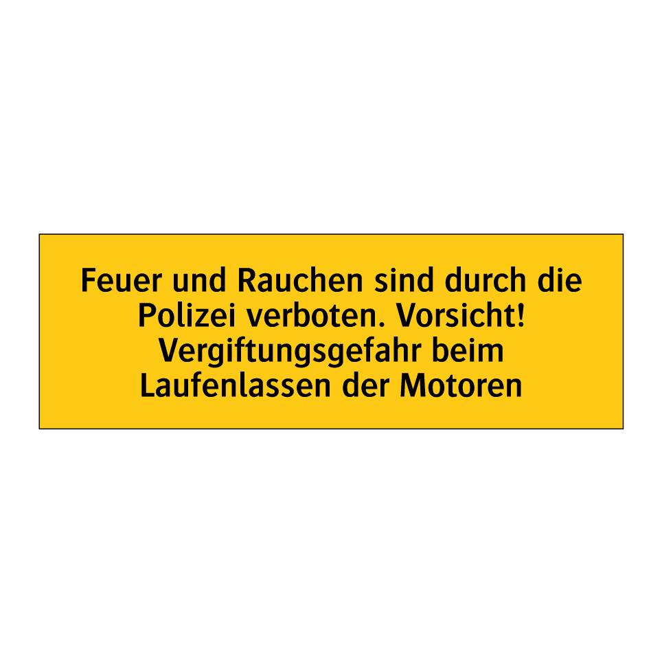 Warnschild mit dem Text Feuer und Rauchen sind durch die Polizei verboten. Vorsicht! Vergiftungsgefahr beim Laufenlassen der Motoren