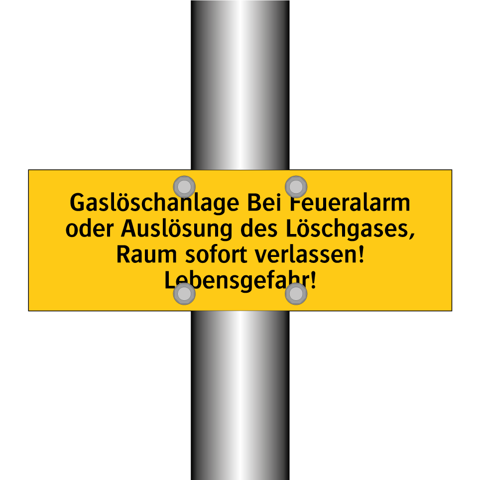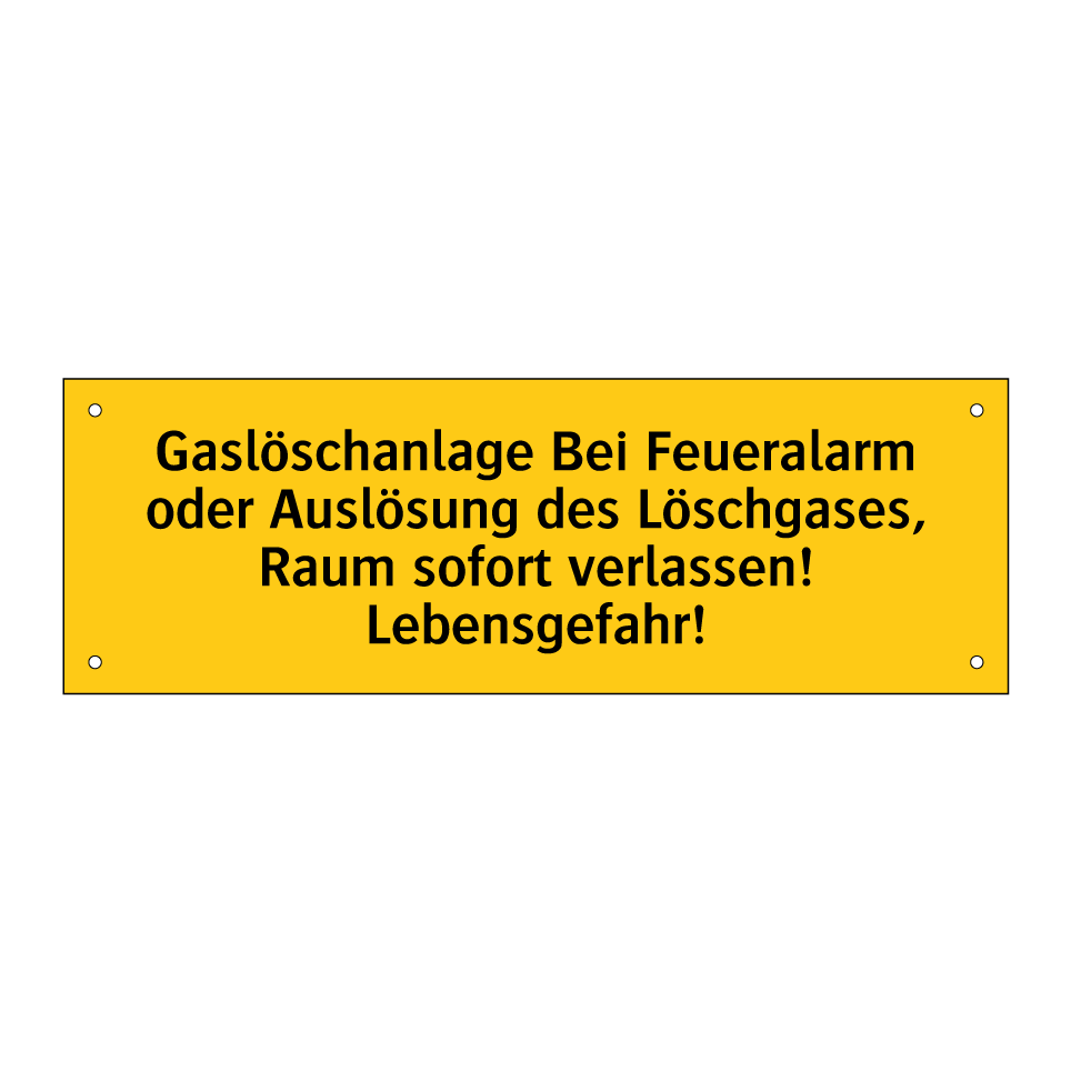 Warnschild mit dem Text Gaslöschanlage Bei Feueralarm oder Auslösung des Löschgases, Raum sofort verlassen! Lebensgefahr!