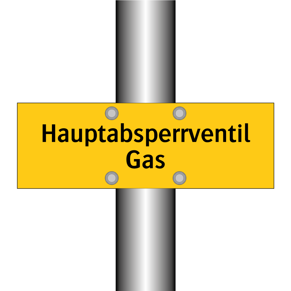 Warnschild mit dem Text Hauptabsperrventil Gas