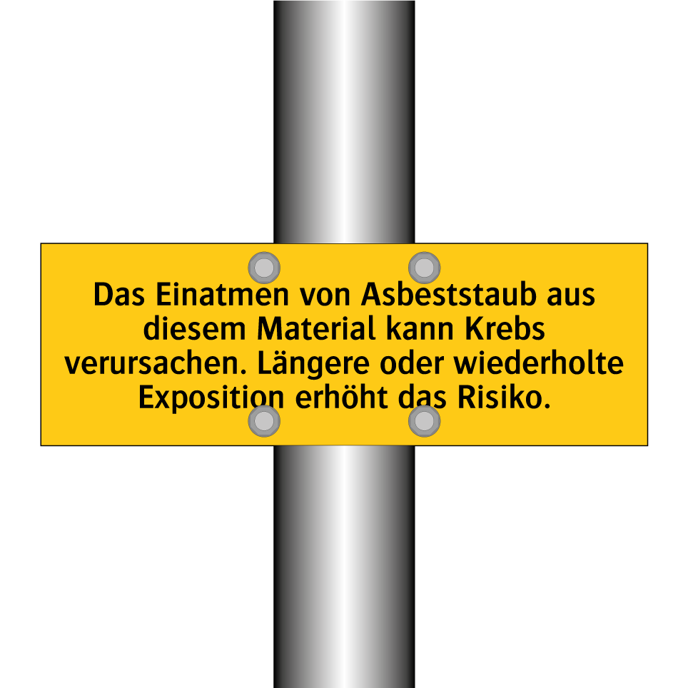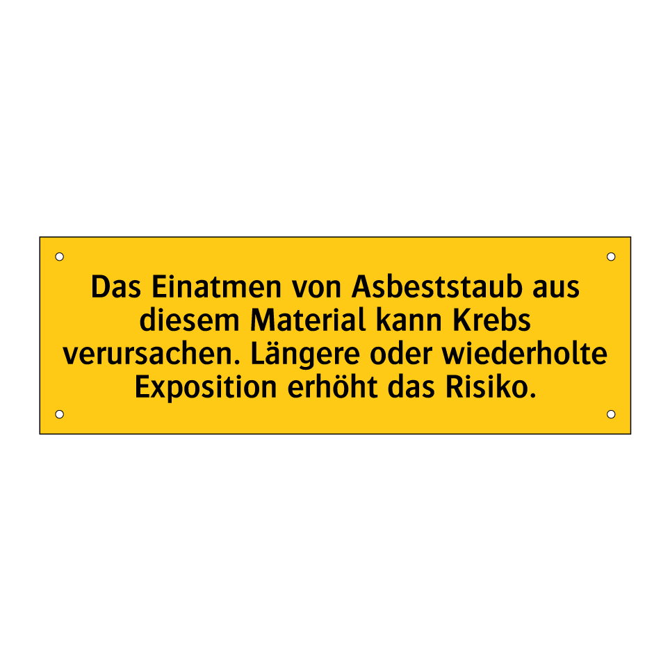 Warnschild mit dem Text Das Einatmen von Asbeststaub aus diesem Material kann Krebs verursachen. Längere oder wiederholte Exposition erhöht das Risiko.