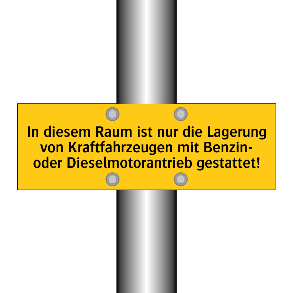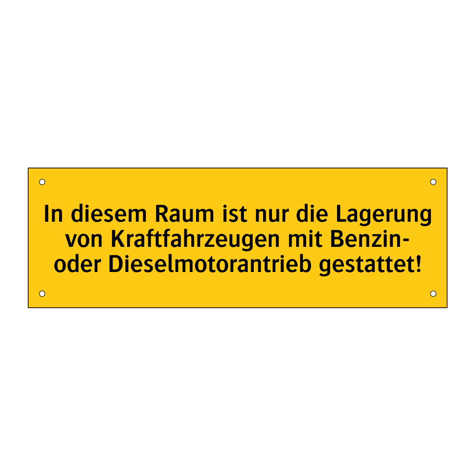 Warnschild mit dem Text In diesem Raum ist nur die Lagerung von Kraftfahrzeugen mit Benzin- oder Dieselmotorantrieb gestattet!