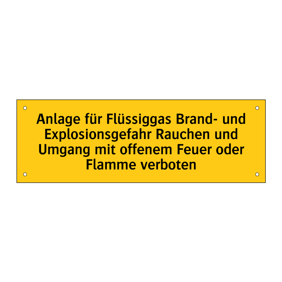 Warnschild mit dem Text Anlage für Flüssiggas Brand- und Explosionsgefahr Rauchen und Umgang mit offenem Feuer oder Flamme verboten