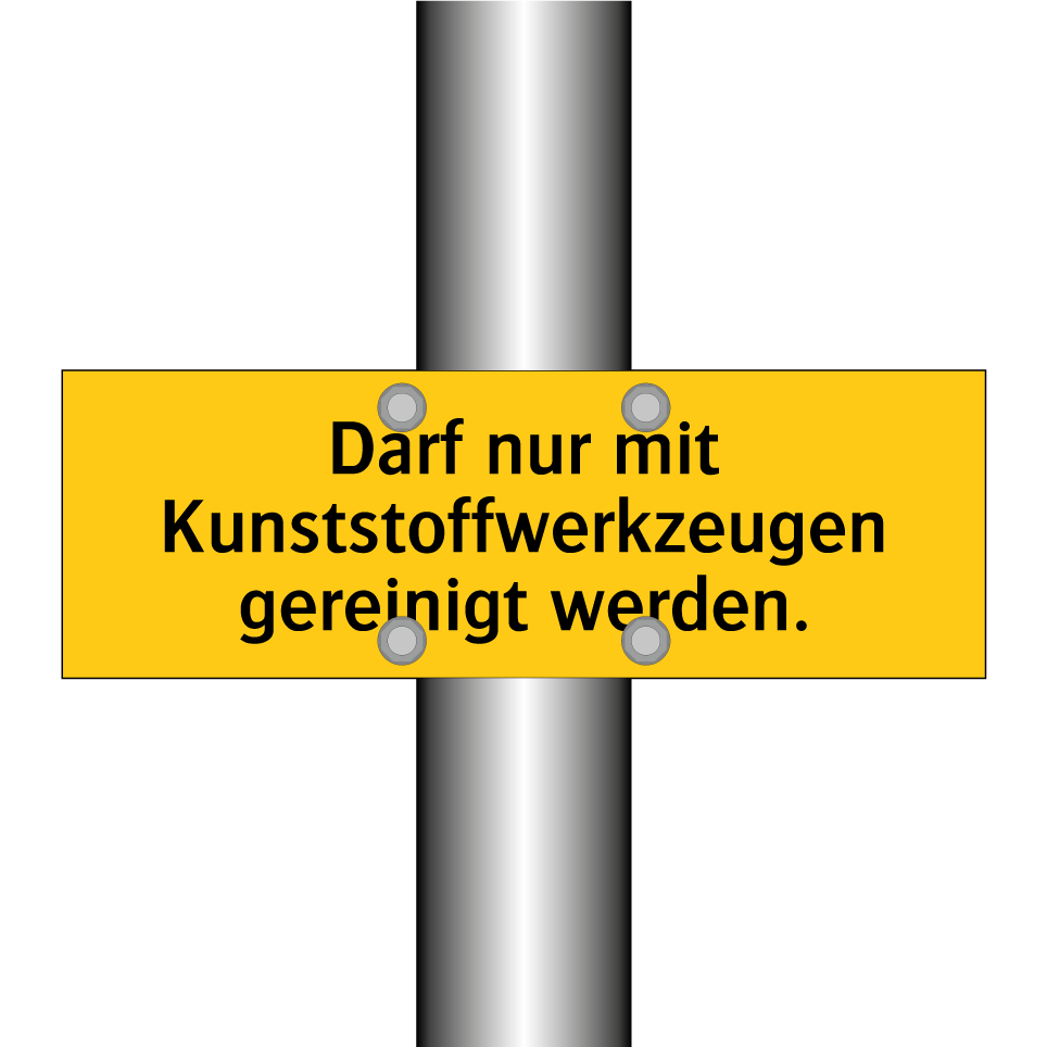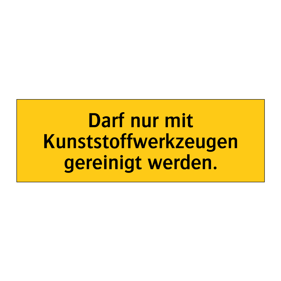 Warnschild mit dem Text Darf nur mit Kunststoffwerkzeugen gereinigt werden.