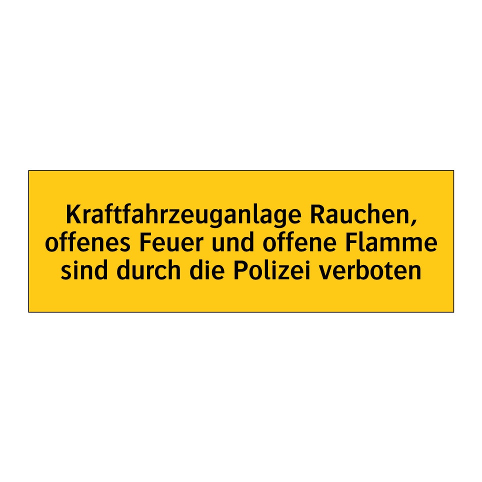Warnschild mit dem Text Kraftfahrzeuganlage Rauchen, offenes Feuer und offene Flamme sind durch die Polizei verboten