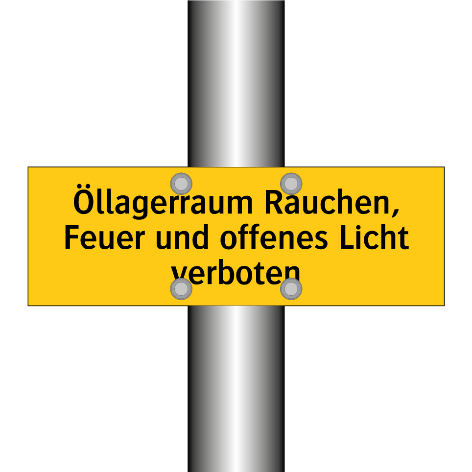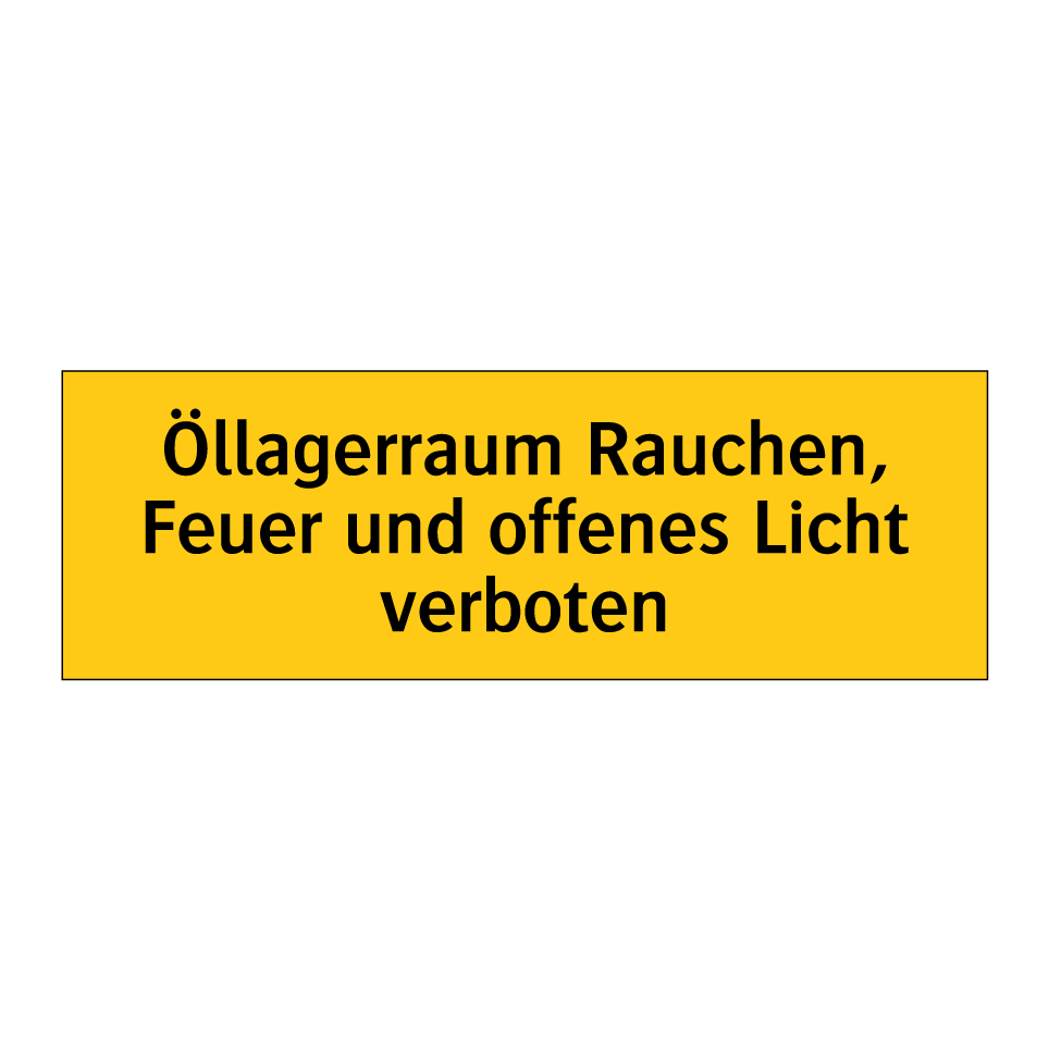 Warnschild mit dem Text Öllagerraum Rauchen, Feuer und offenes Licht verboten