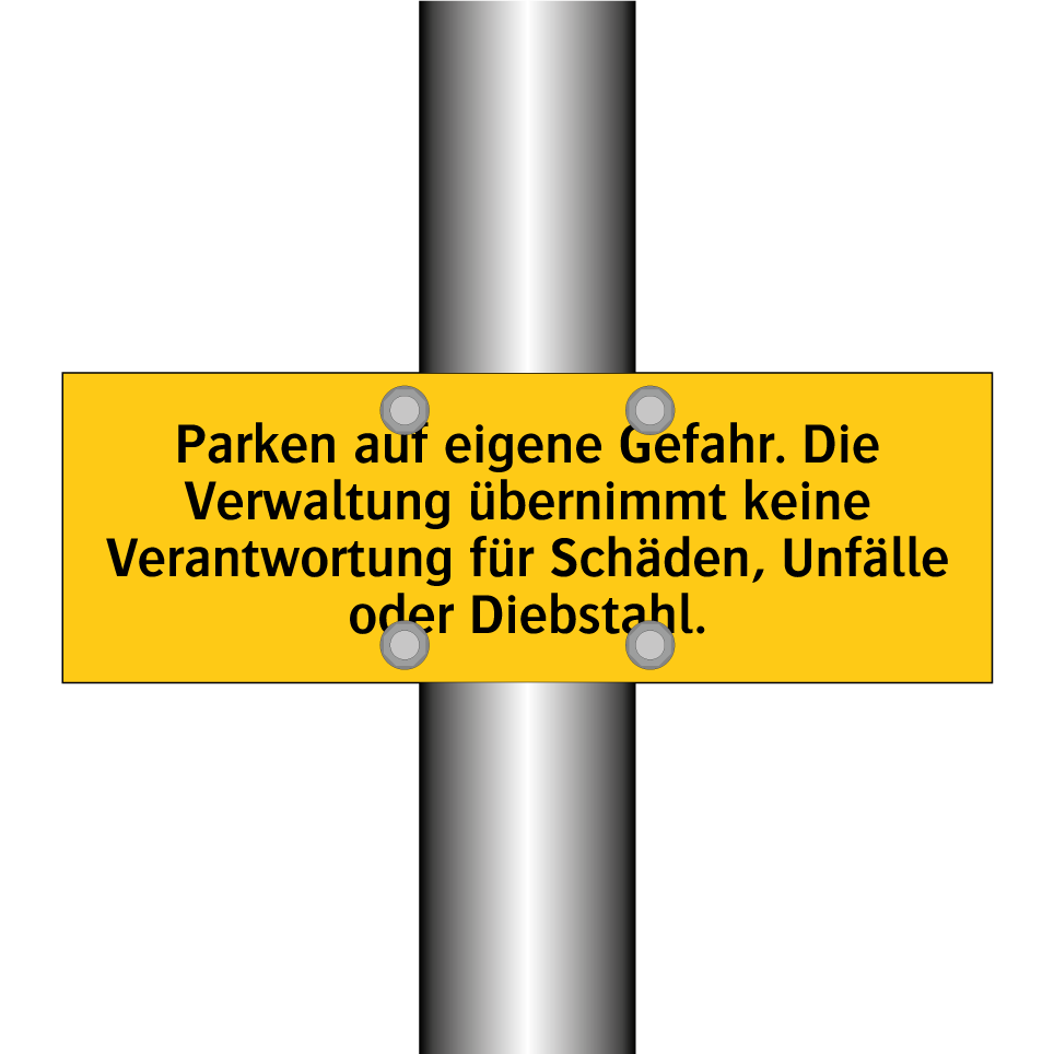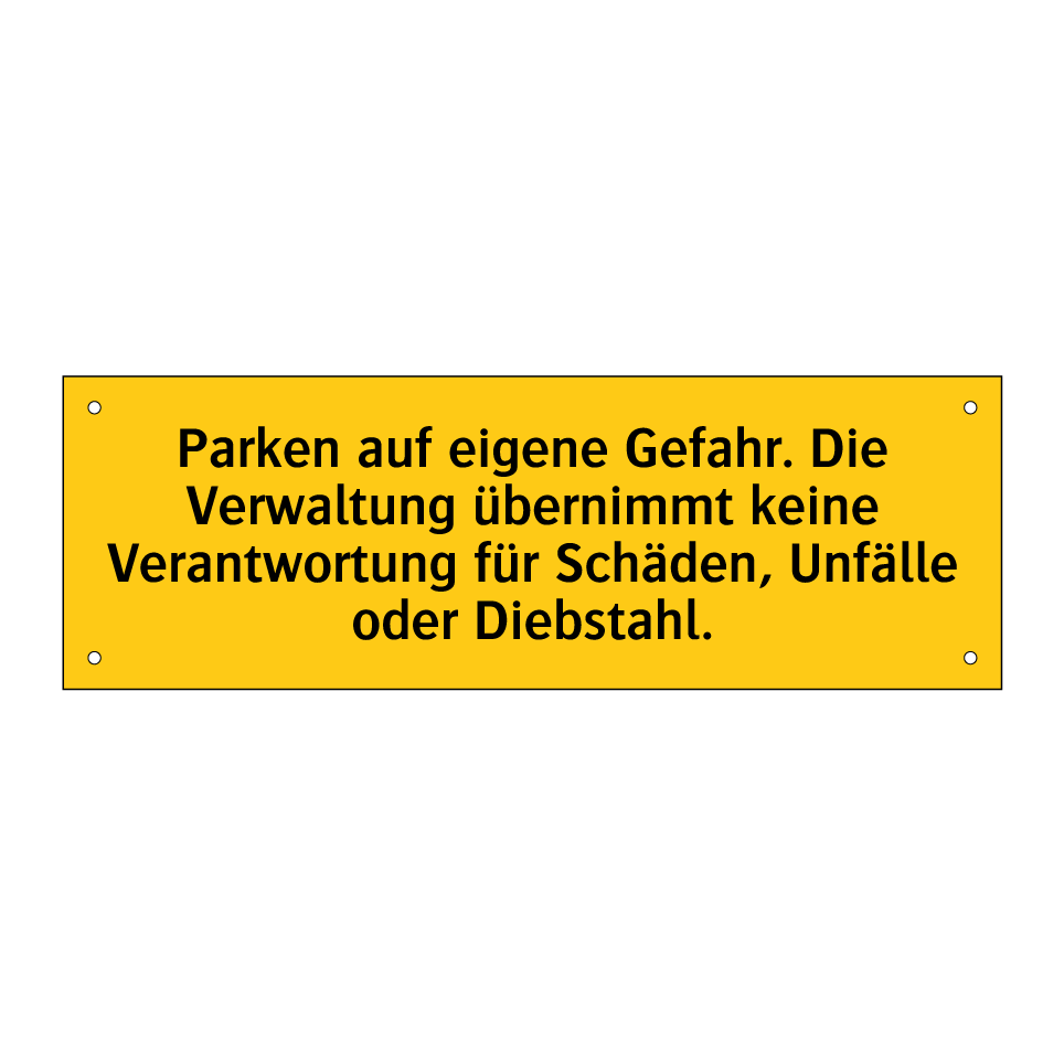 Warnschild mit dem Text Parken auf eigene Gefahr. Die Verwaltung übernimmt keine Verantwortung für Schäden, Unfälle oder Diebstahl.