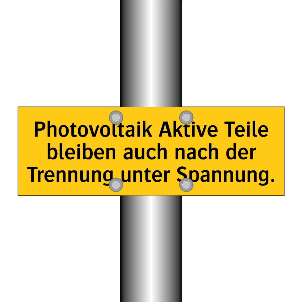 Warnschild mit dem Text Photovoltaik Aktive Teile bleiben auch nach der Trennung unter Spannung.
