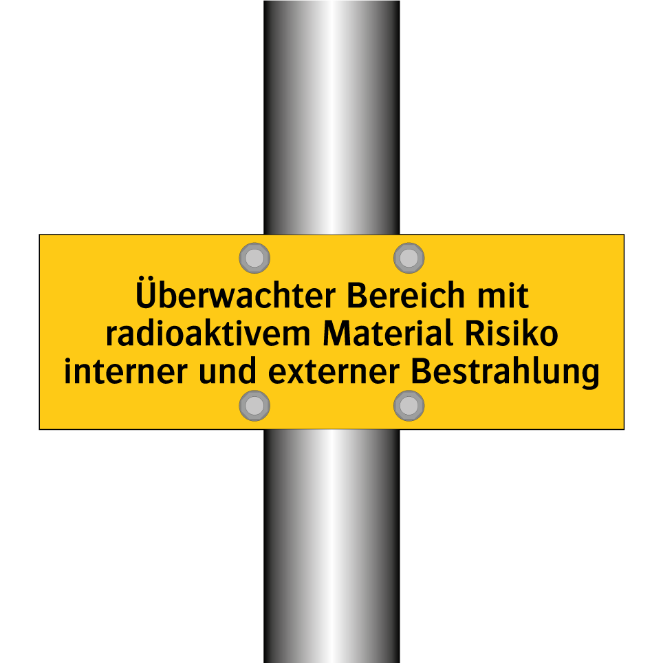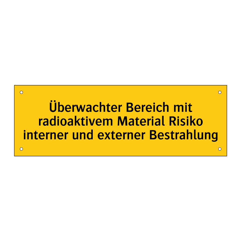 Warnschild mit dem Text Überwachter Bereich mit radioaktivem Material Risiko interner und externer Bestrahlung