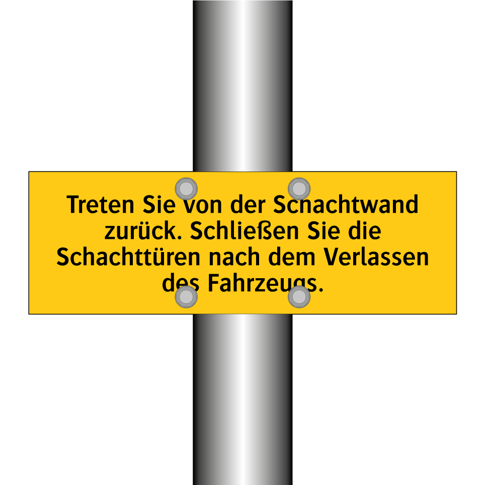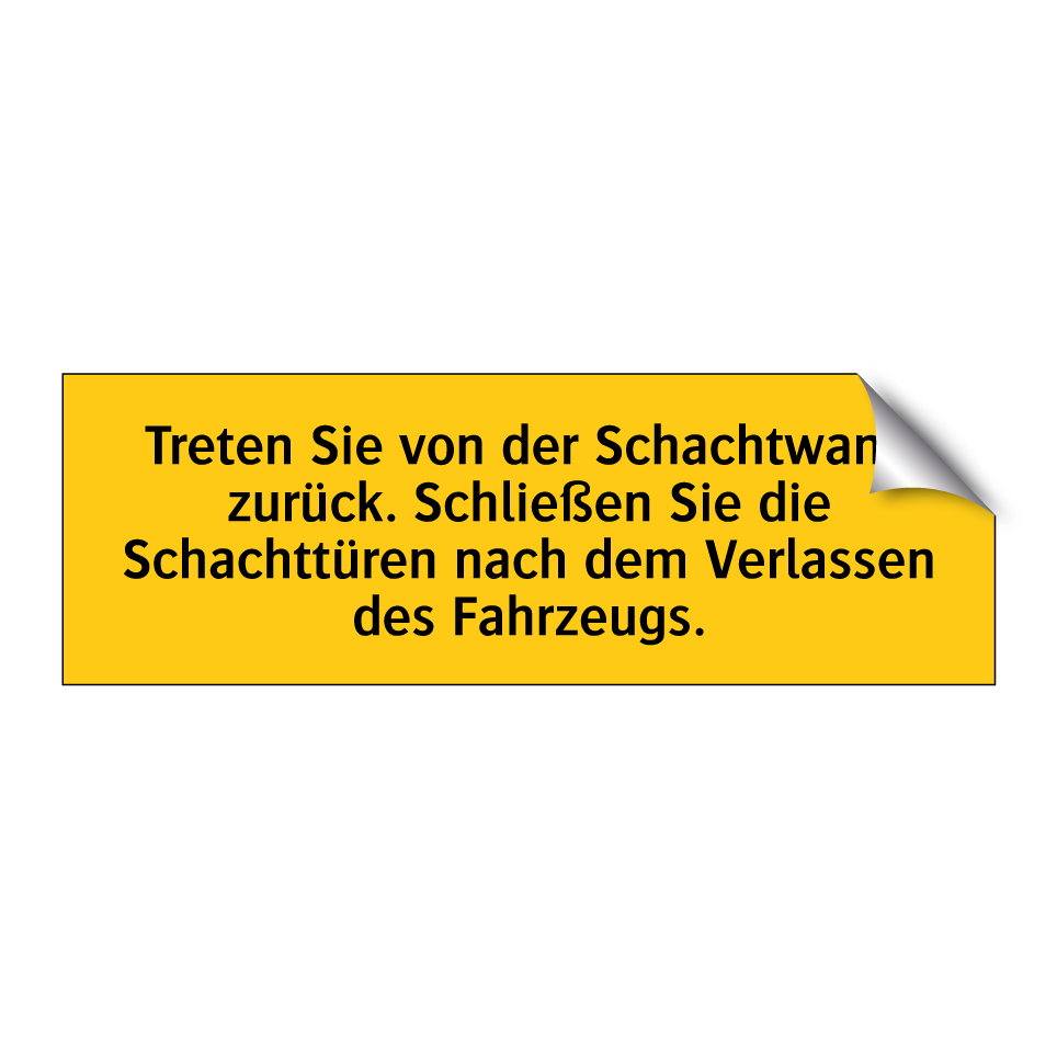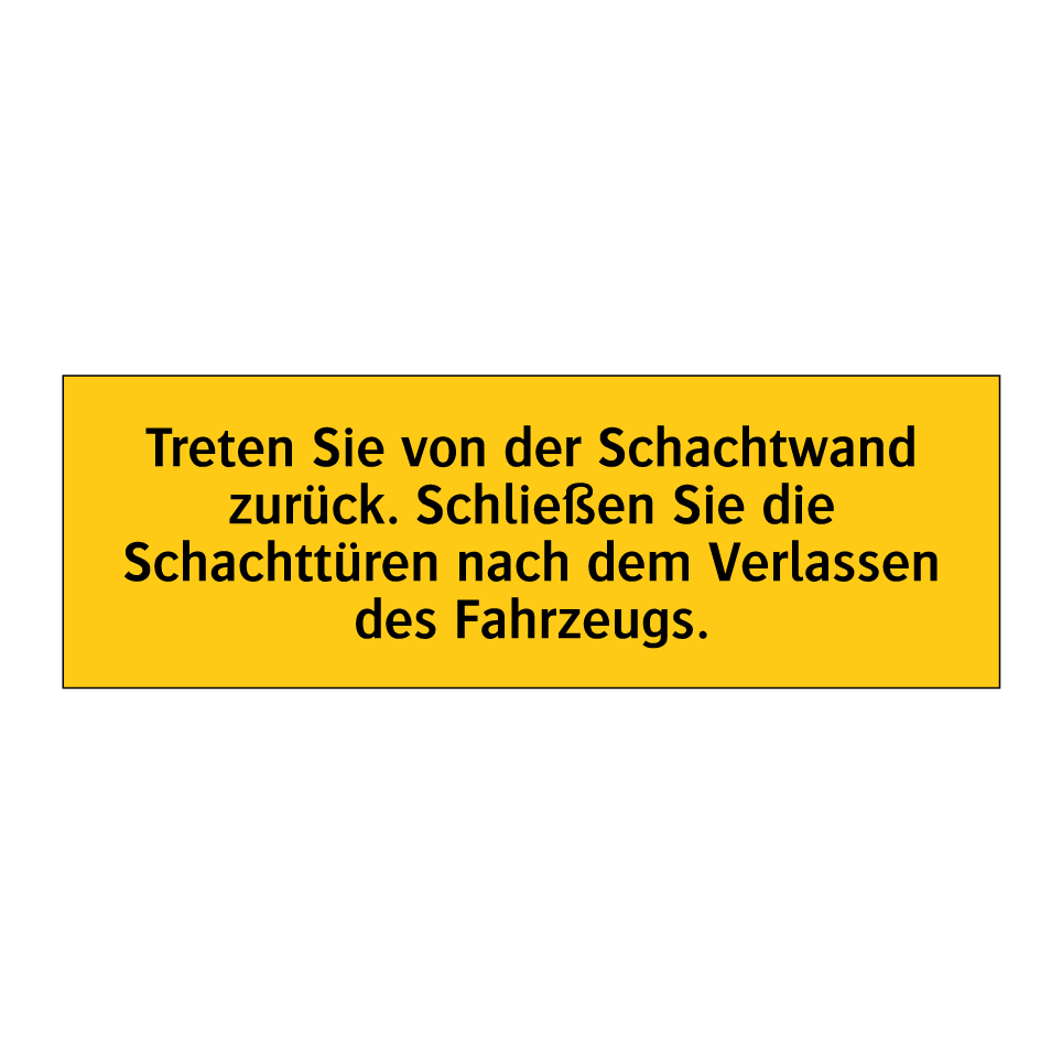 Warnschild mit dem Text Treten Sie von der Schachtwand zurück. Schließen Sie die Schachttüren nach dem Verlassen des Fahrzeugs.