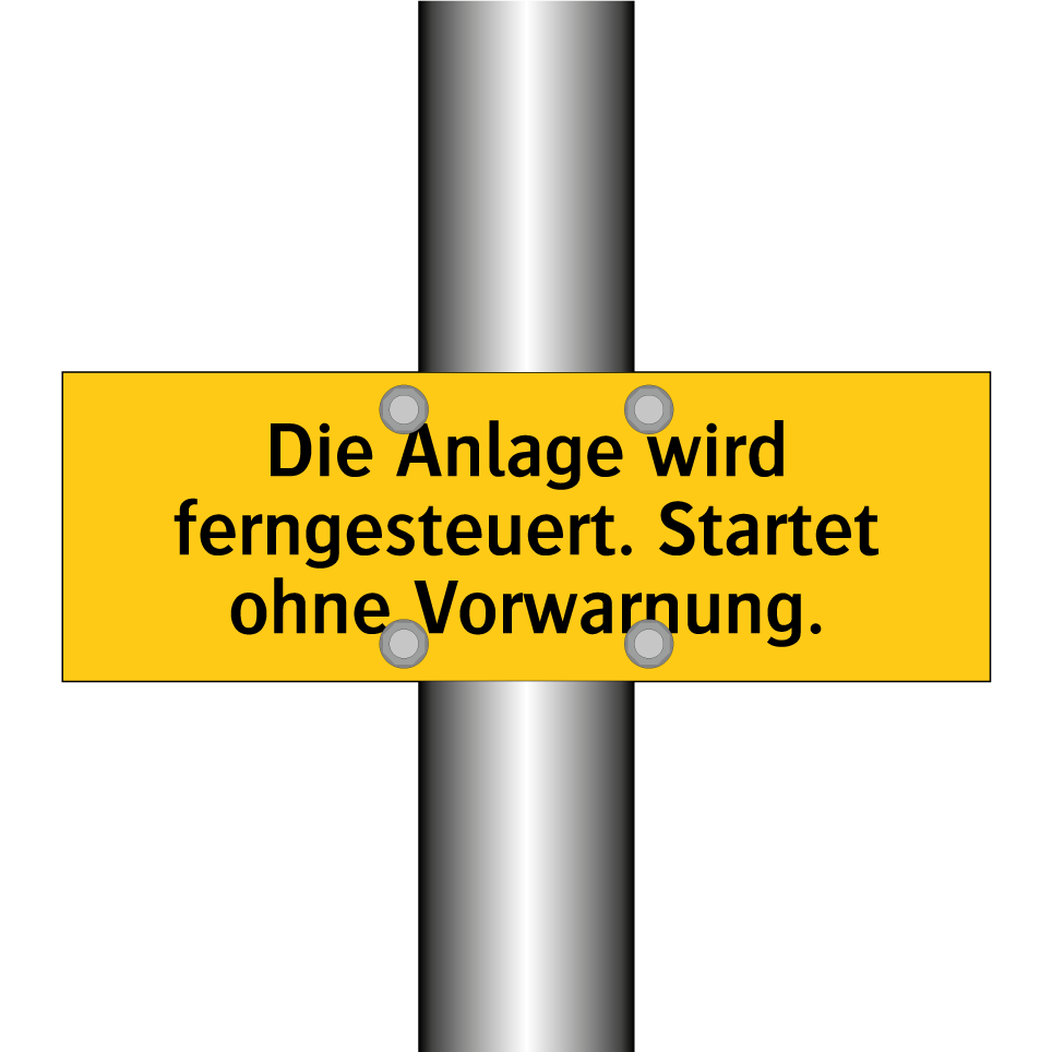 Warnschild mit dem Text Die Anlage wird ferngesteuert. Startet ohne Vorwarnung.
