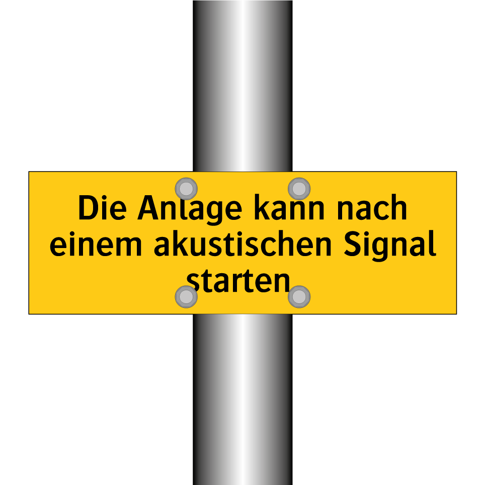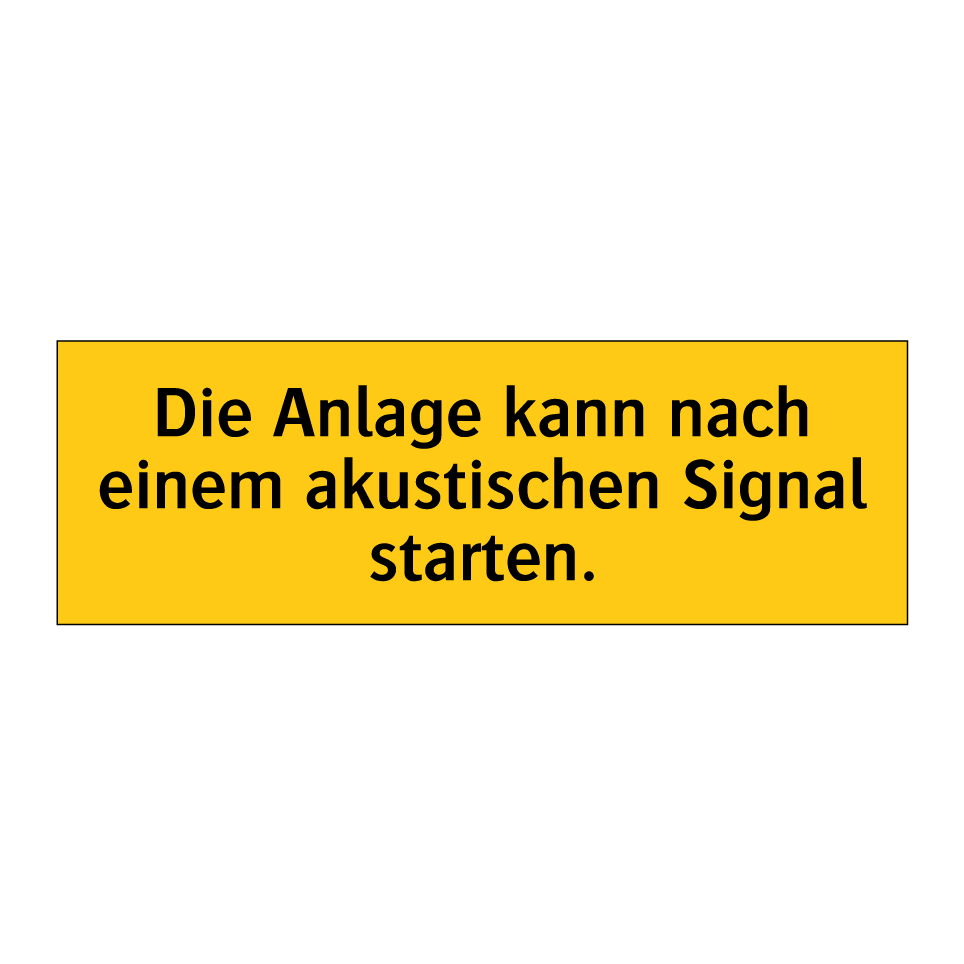 Warnschild mit dem Text Die Anlage kann nach einem akustischen Signal starten.