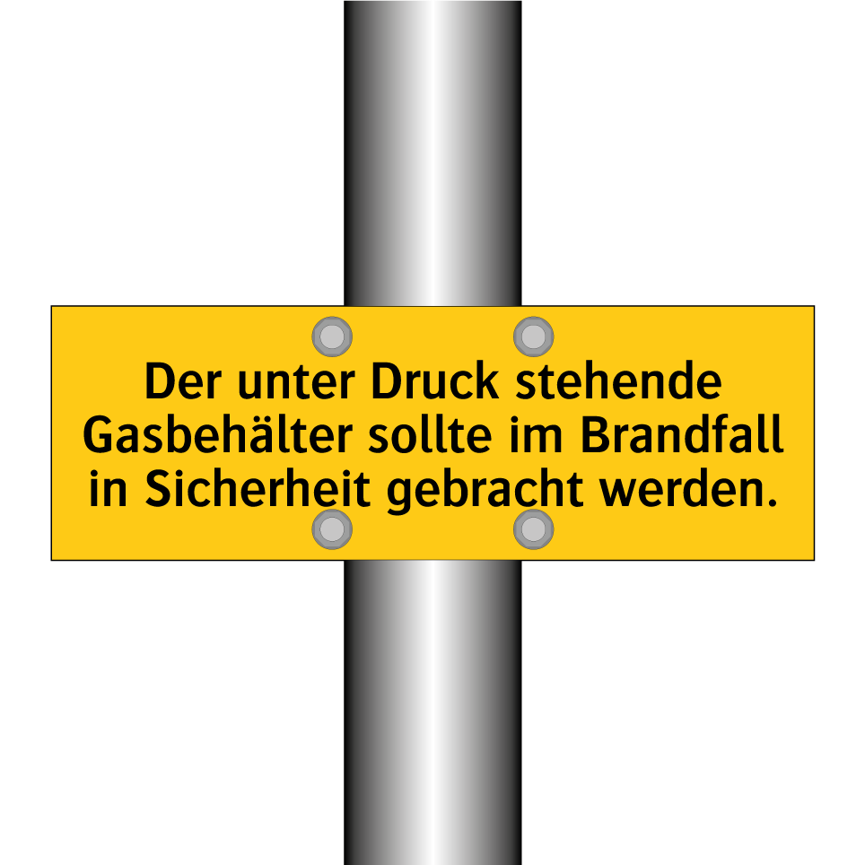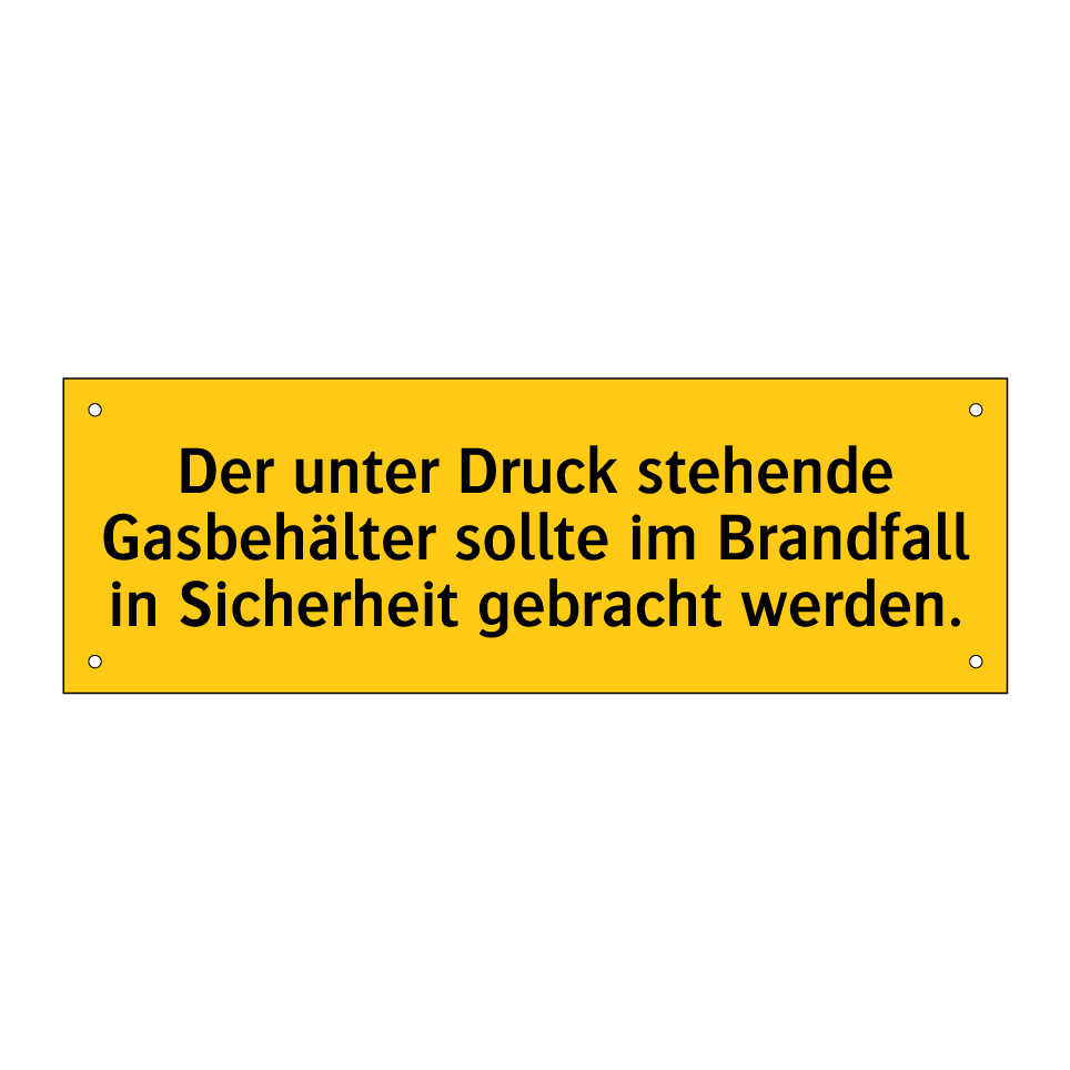 Warnschild mit dem Text Der unter Druck stehende Gasbehälter sollte im Brandfall in Sicherheit gebracht werden.