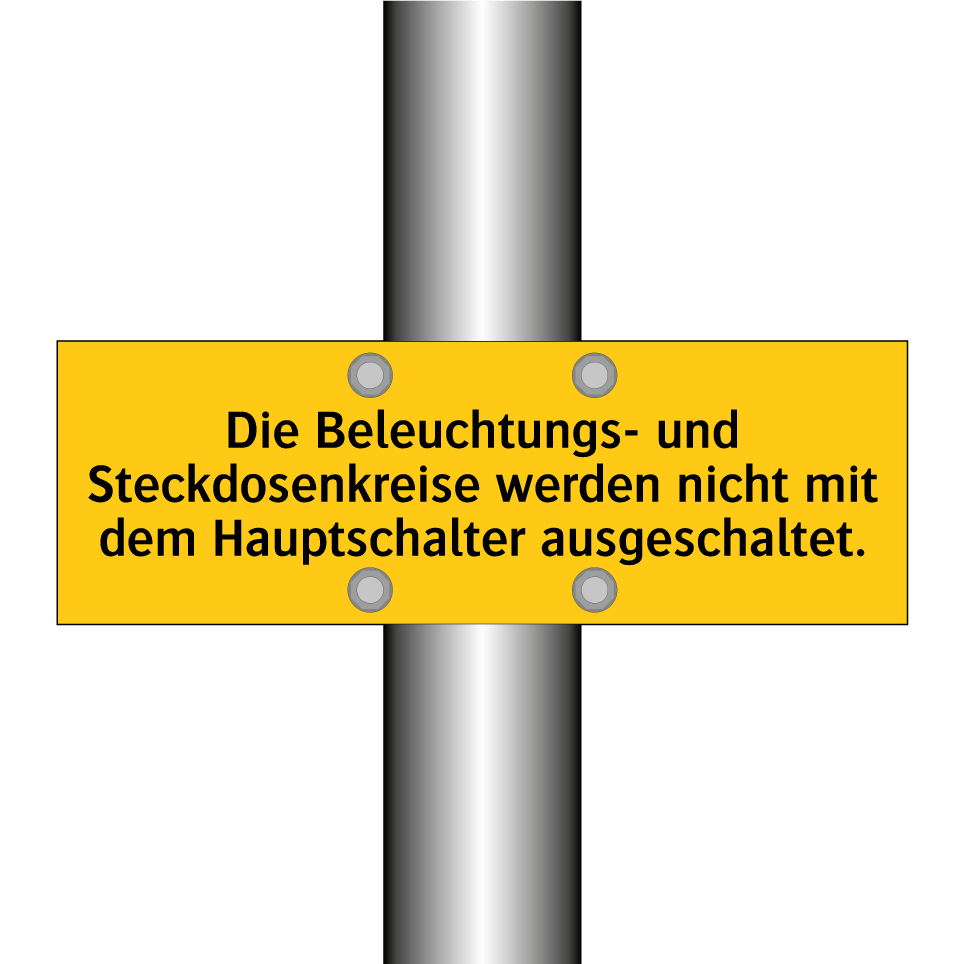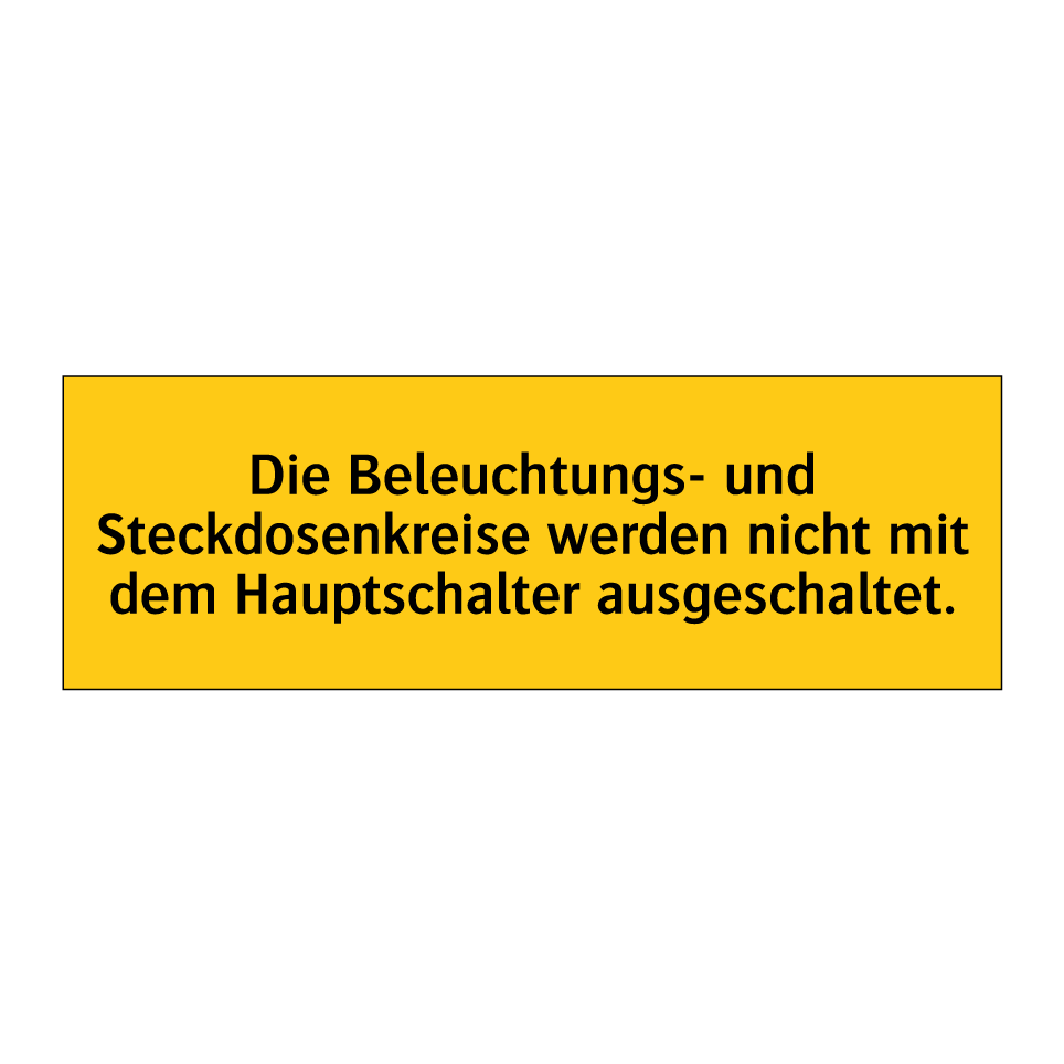 Warnschild mit dem Text Die Beleuchtungs- und Steckdosenkreise werden nicht mit dem Hauptschalter ausgeschaltet.