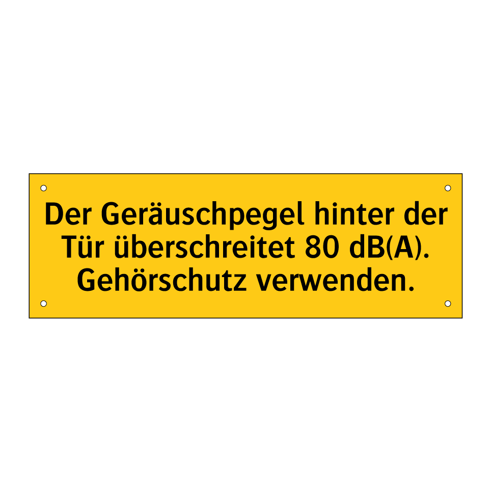 Warnschild mit dem Text Der Geräuschpegel hinter der Tür überschreitet 80 dB(A). Gehörschutz verwenden.