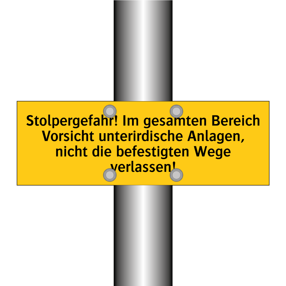 Diese auffällige Warnschild mit gelbem Hintergrund und schwarzer Schrift ist ideal, um auf potenzielle Gefahren in Bereichen mit unterirdischen Anlagen hinzuweisen. Sie dient dazu, Personen darauf aufmerksam zu machen, die befestigten Wege nicht zu verlassen, um Stolperfallen zu vermeiden. Diese Warnschilder sind besonders nützlich in Industriegebieten, Baustellen oder anderen Orten, an denen unterirdische Strukturen vorhanden sind. Platzieren Sie das Schild an gut sichtbaren Stellen, um die Sicherheit der Passanten zu gewährleisten. Es ist ein unverzichtbares Element für die Gefahrenprävention und trägt zur Erhöhung der Sicherheit in gefährdeten Bereichen bei.