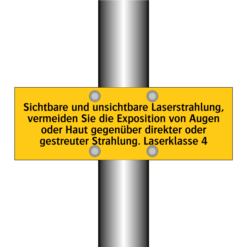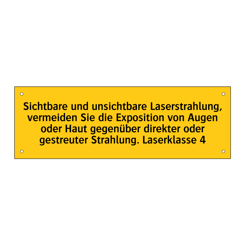 Warnschild mit dem Text Sichtbare und unsichtbare Laserstrahlung, vermeiden Sie die Exposition von Augen oder Haut gegenüber direkter oder gestreuter Strahlung. Laserklasse 4