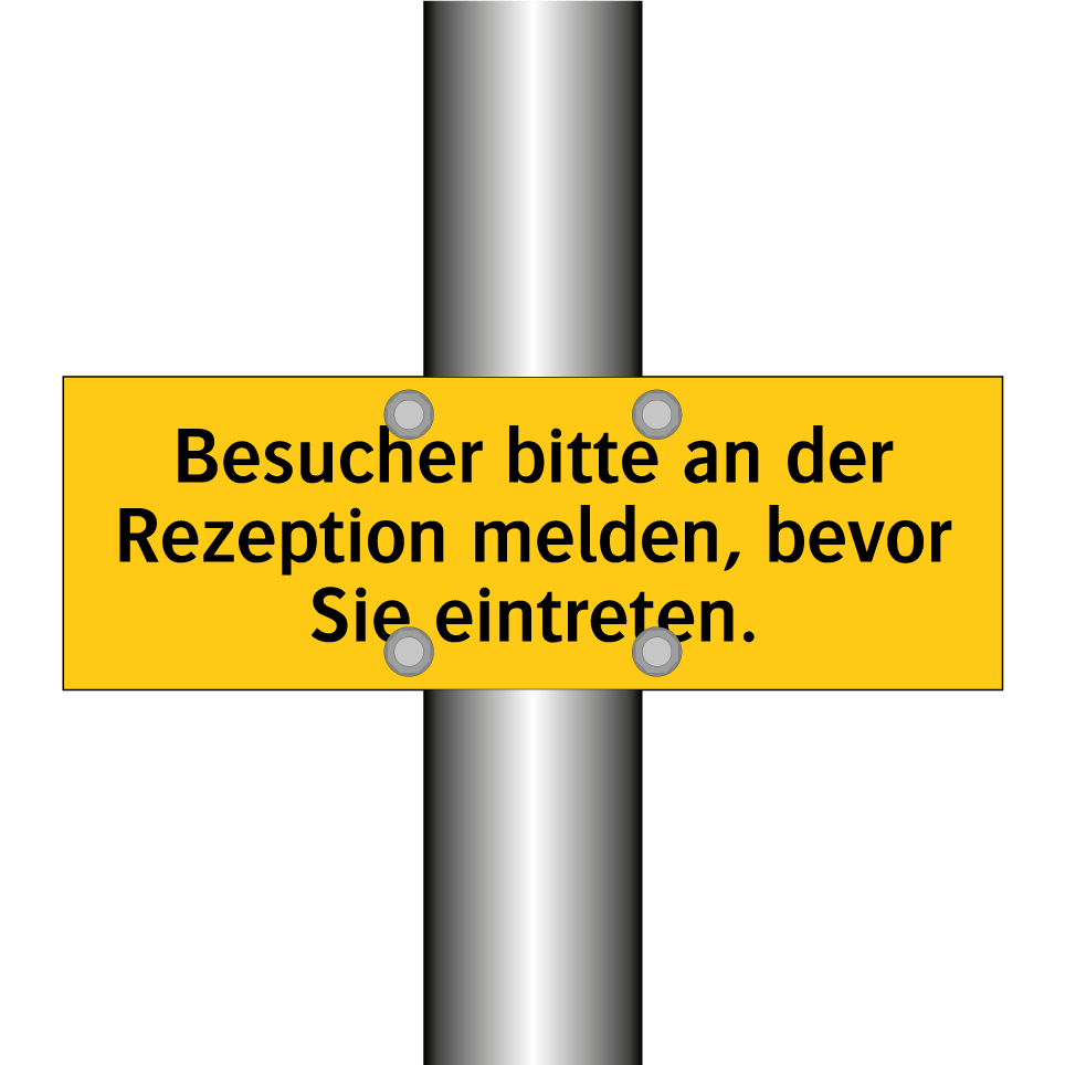 Warnschild mit dem Text Besucher bitte an der Rezeption melden, bevor Sie eintreten.