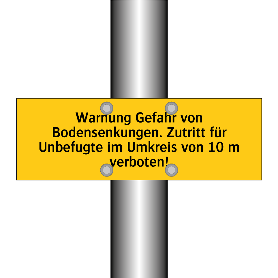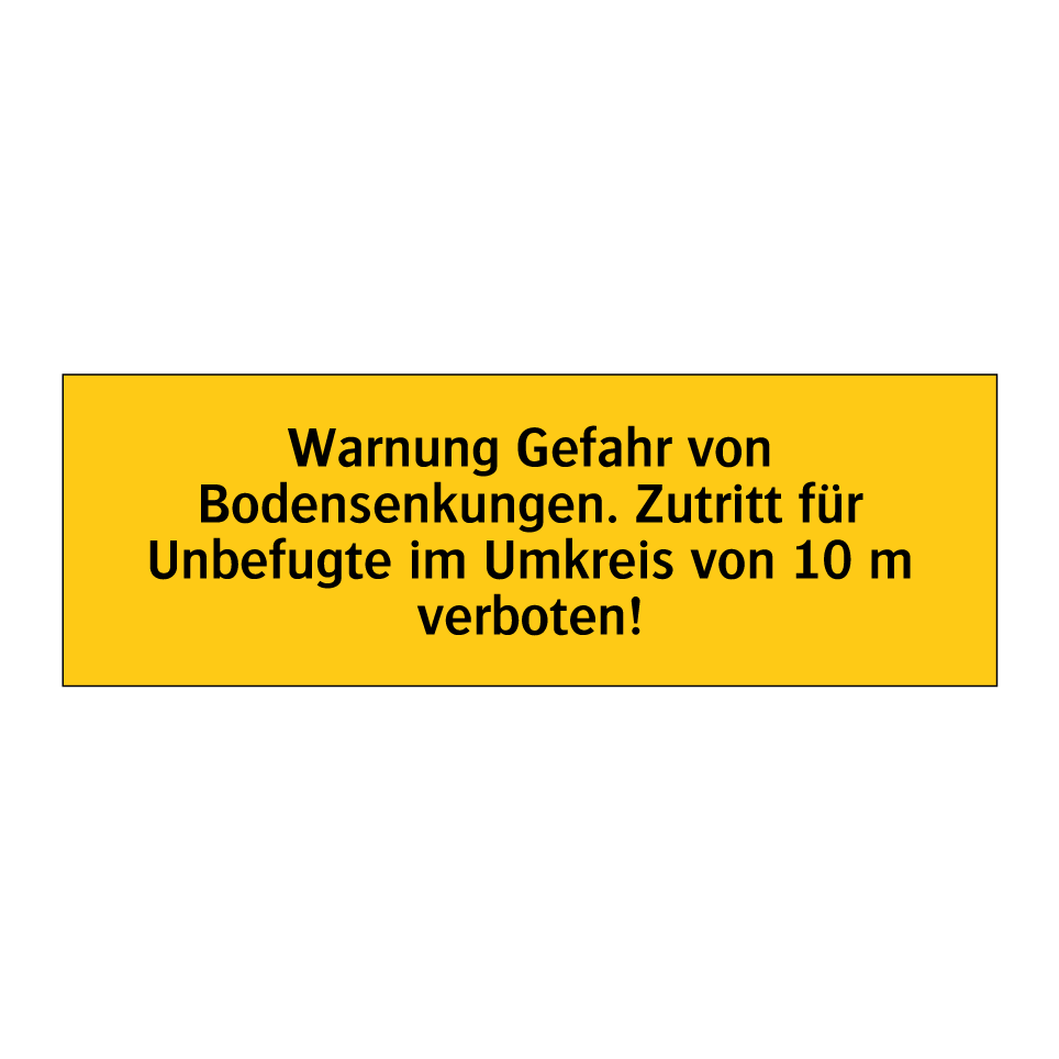Warnschild mit dem Text Warnung Gefahr von Bodensenkungen. Zutritt für Unbefugte im Umkreis von 10 m verboten!