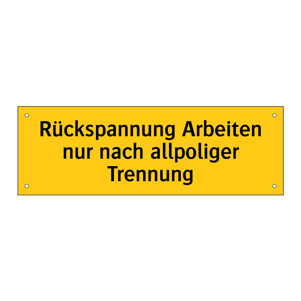 Warnschild mit dem Text Rückspannung Arbeiten nur nach allpoliger Trennung