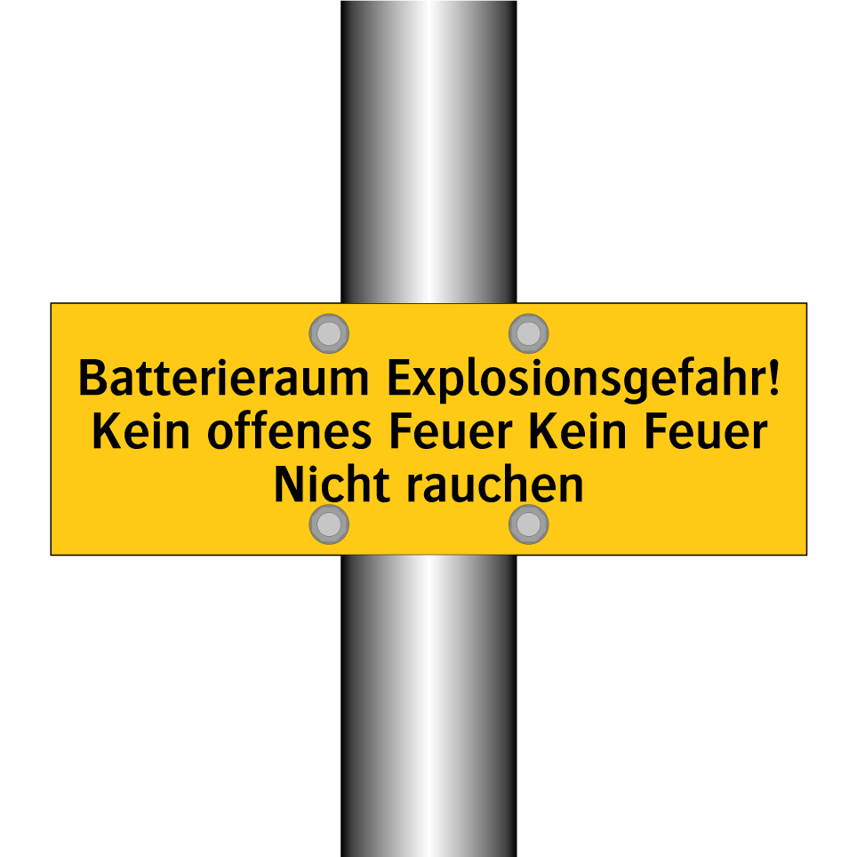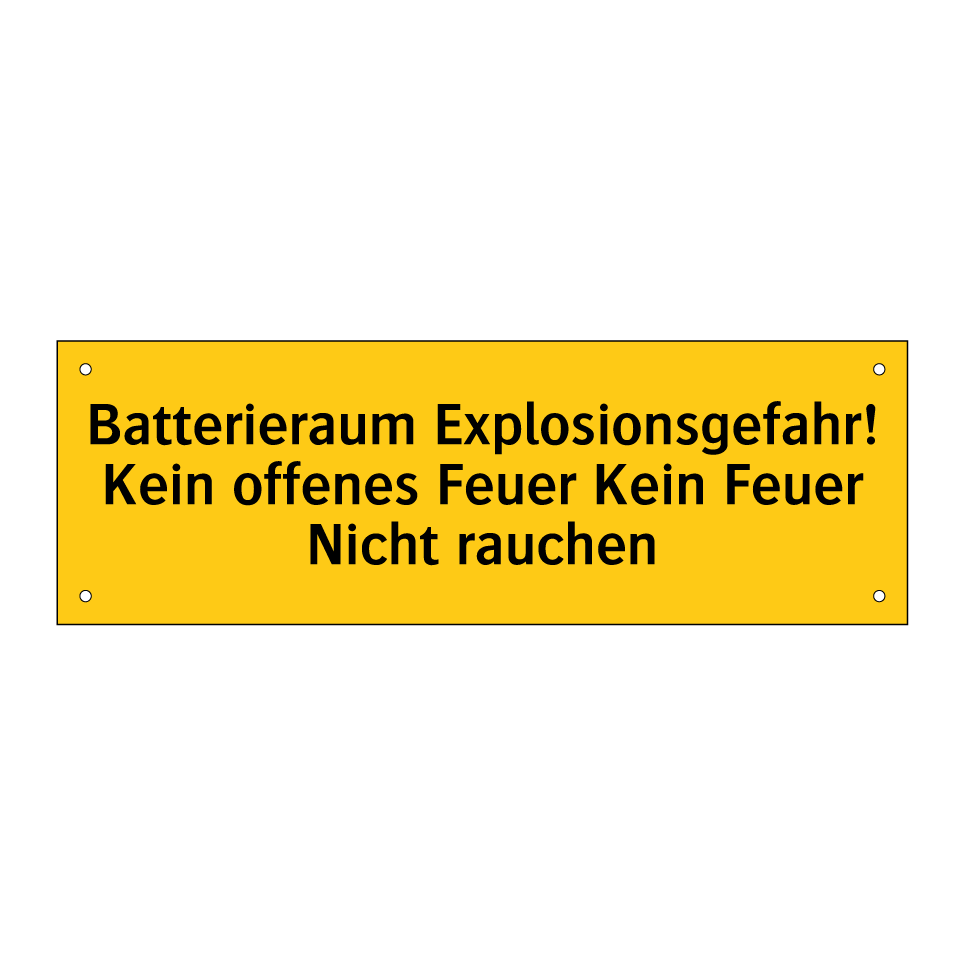 Warnschild mit dem Text Batterieraum Explosionsgefahr! Kein offenes Feuer Kein Feuer Nicht rauchen