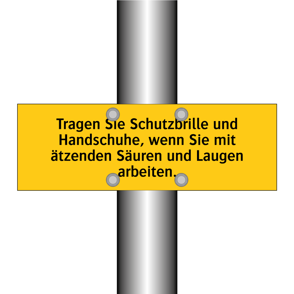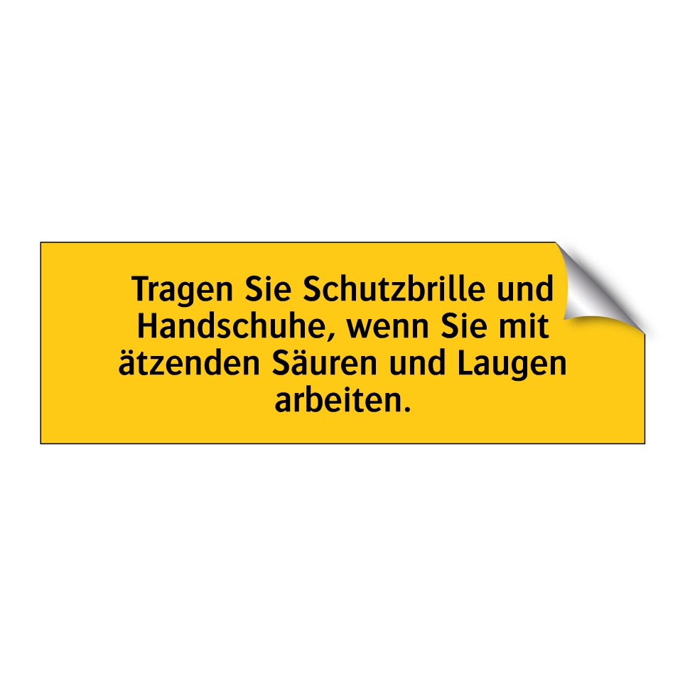 Warnschild mit dem Text Tragen Sie Schutzbrille und Handschuhe, wenn Sie mit ätzenden Säuren und Laugen arbeiten.