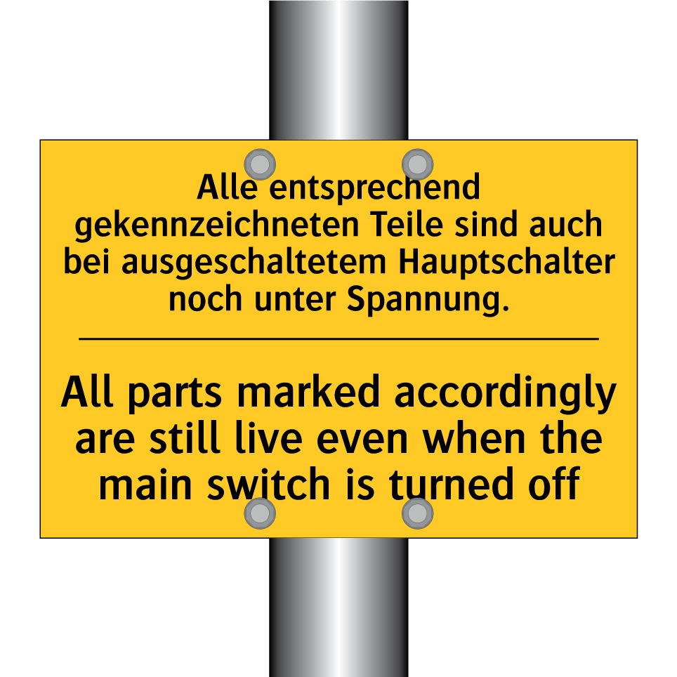Zweisprachiges Warnschild mit deutschem Text Alle entsprechend gekennzeichneten Teile sind auch bei ausgeschaltetem Hauptschalter noch unter Spannung. und englischem Text All parts marked accordingly are still live even when the main switch is turned off