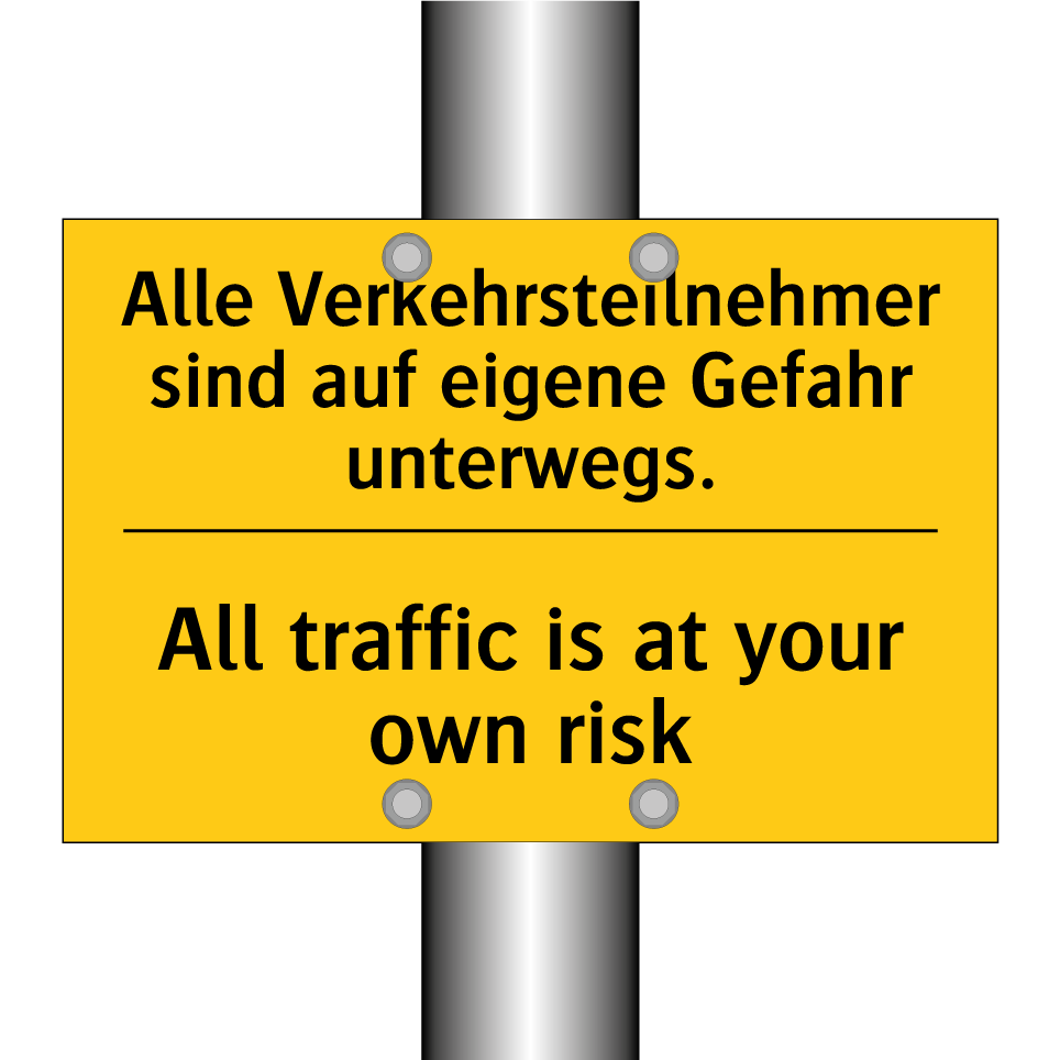 Zweisprachiges Warnschild mit deutschem Text Alle Verkehrsteilnehmer sind auf eigene Gefahr unterwegs. und englischem Text All traffic is at your own risk