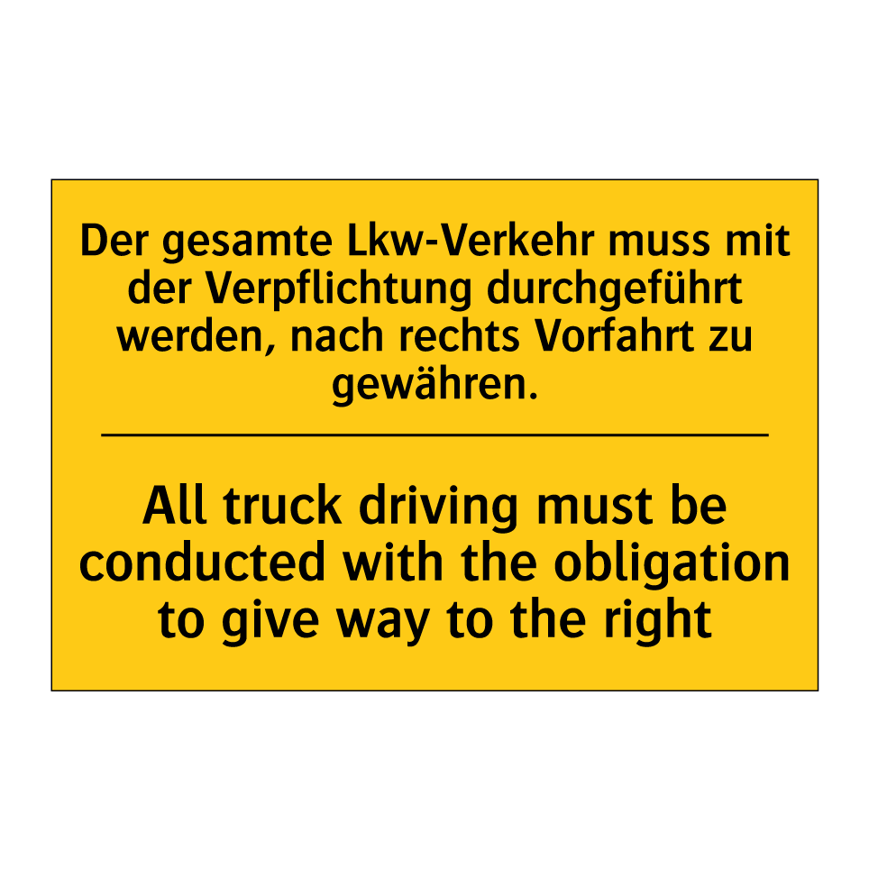 Zweisprachiges Warnschild mit deutschem Text Der gesamte Lkw-Verkehr muss mit der Verpflichtung durchgeführt werden, nach rechts Vorfahrt zu gewähren. und englischem Text All truck driving must be conducted with the obligation to give way to the right