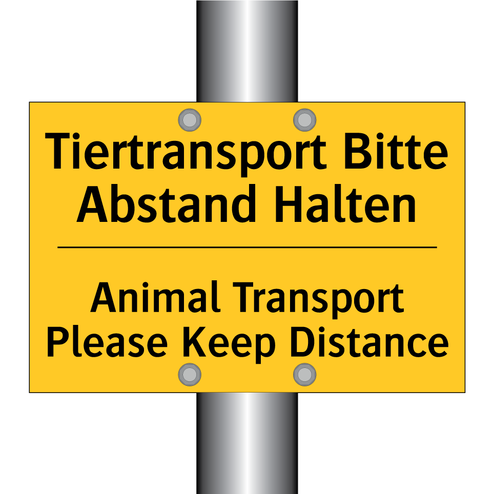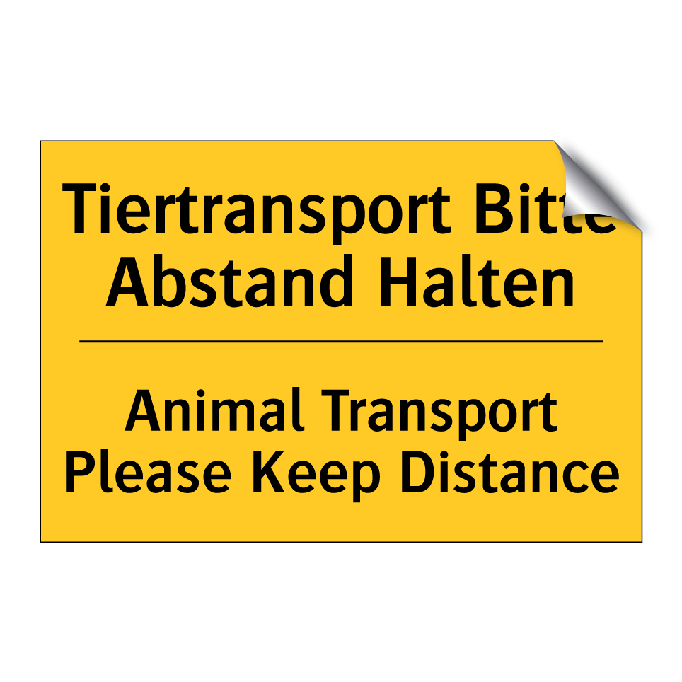 Zweisprachiges Warnschild mit deutschem Text Tiertransport Bitte Abstand Halten und englischem Text Animal Transport Please Keep Distance
