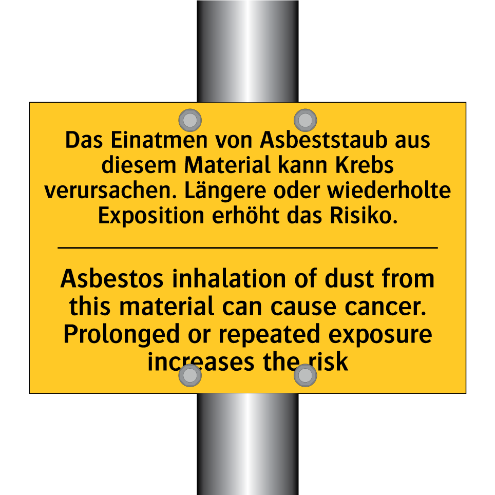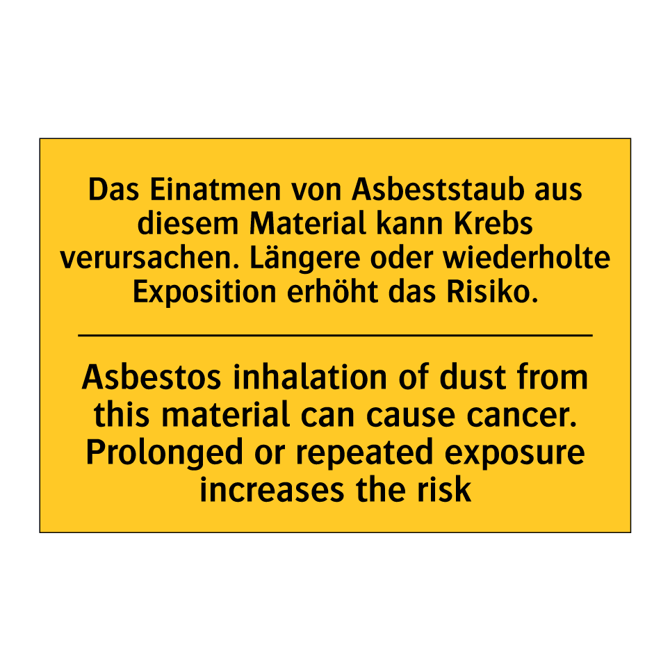 Zweisprachiges Warnschild mit deutschem Text Das Einatmen von Asbeststaub aus diesem Material kann Krebs verursachen. Längere oder wiederholte Exposition erhöht das Risiko. und englischem Text Asbestos inhalation of dust from this material can cause cancer. Prolonged or repeated exposure increases the risk