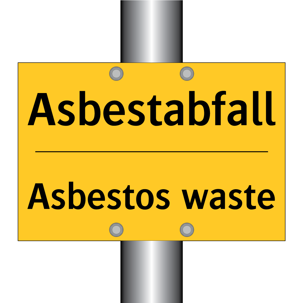 Zweisprachiges Warnschild mit deutschem Text Asbestabfall und englischem Text Asbestos waste