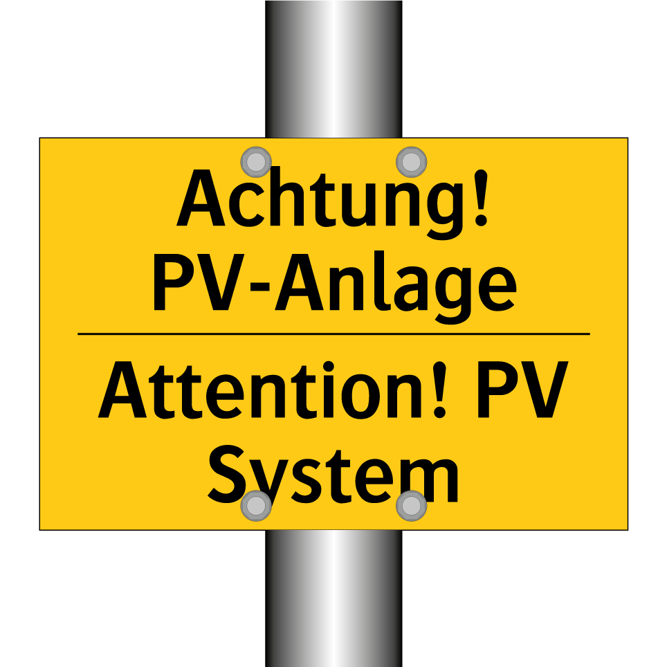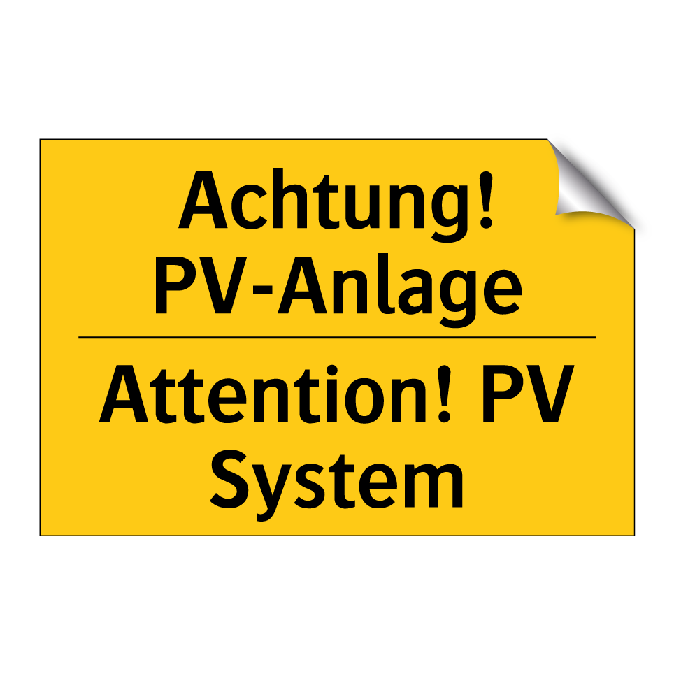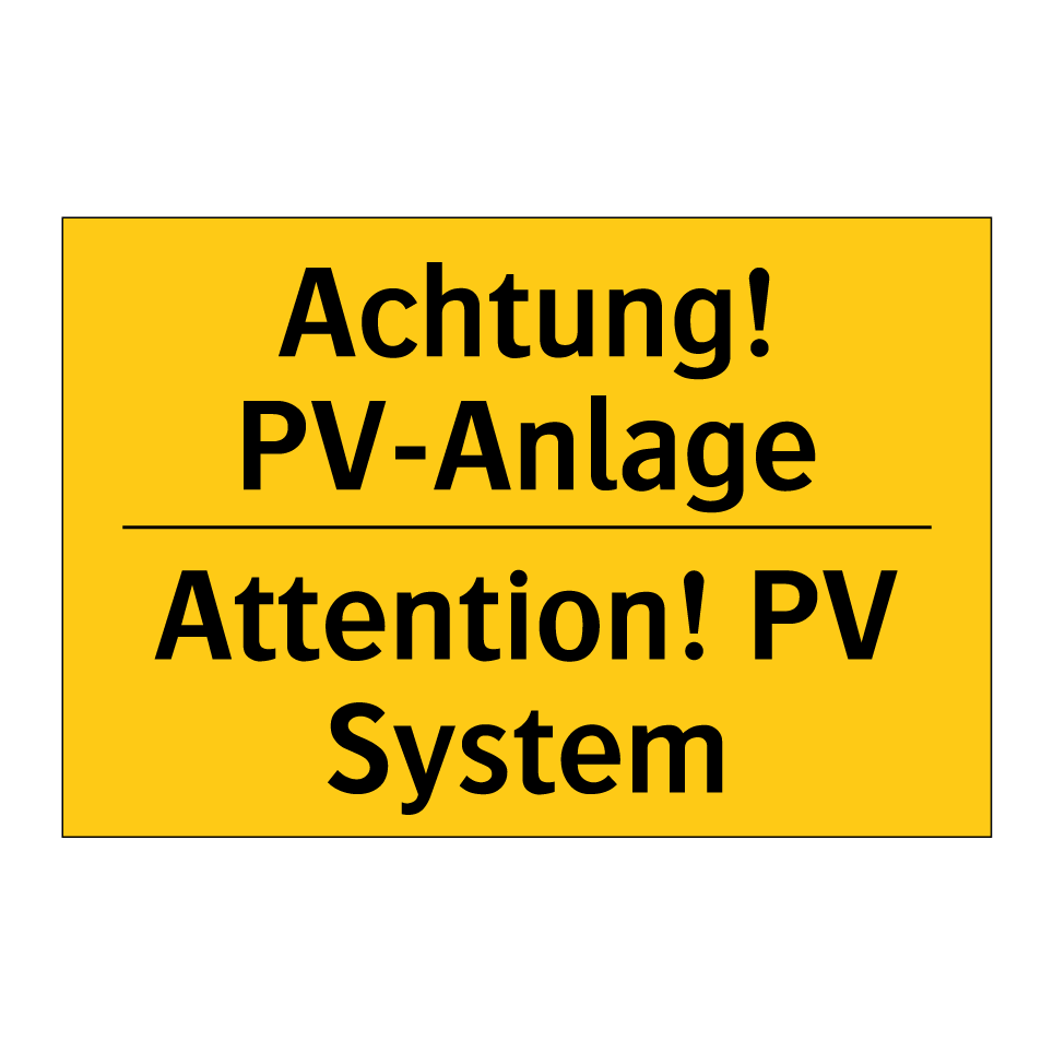 Zweisprachiges Warnschild mit deutschem Text Achtung! PV-Anlage und englischem Text Attention! PV System