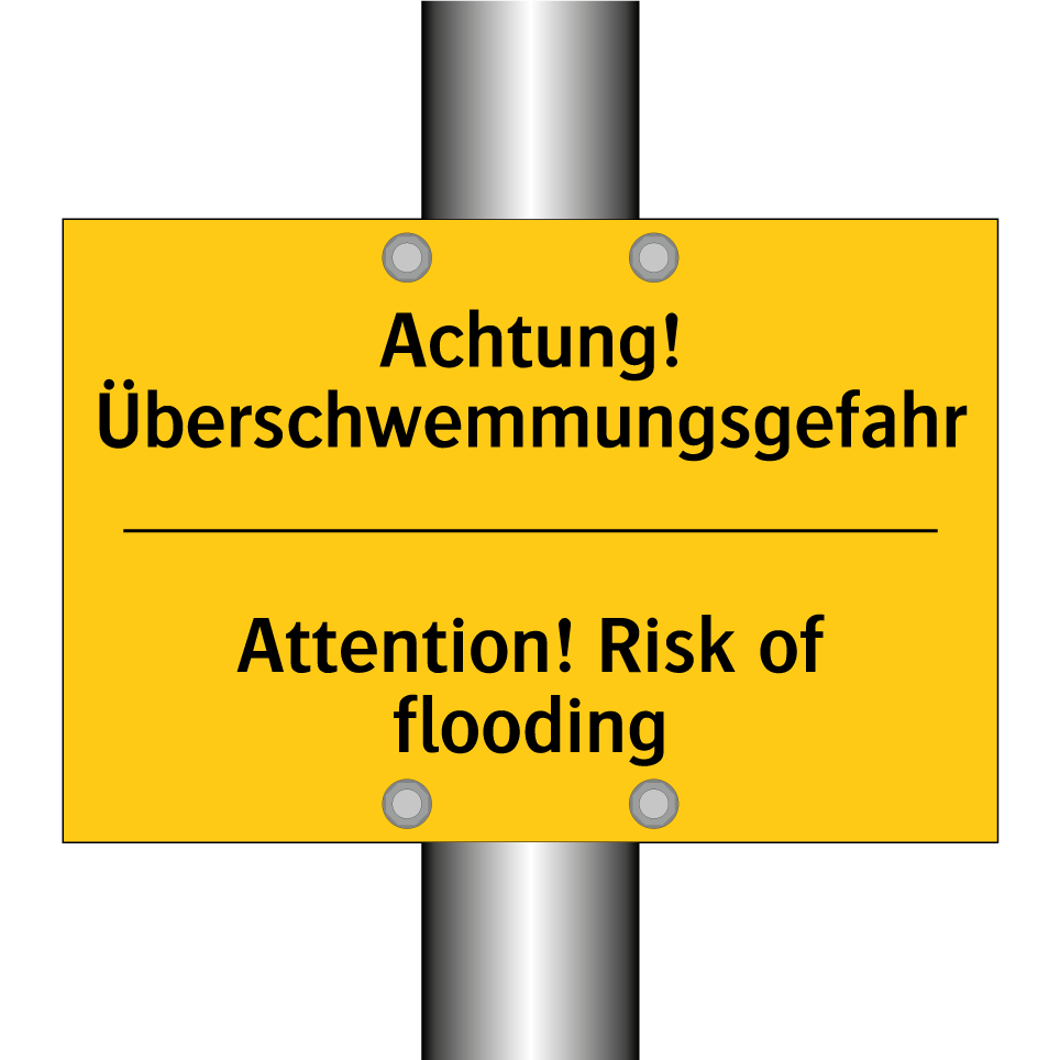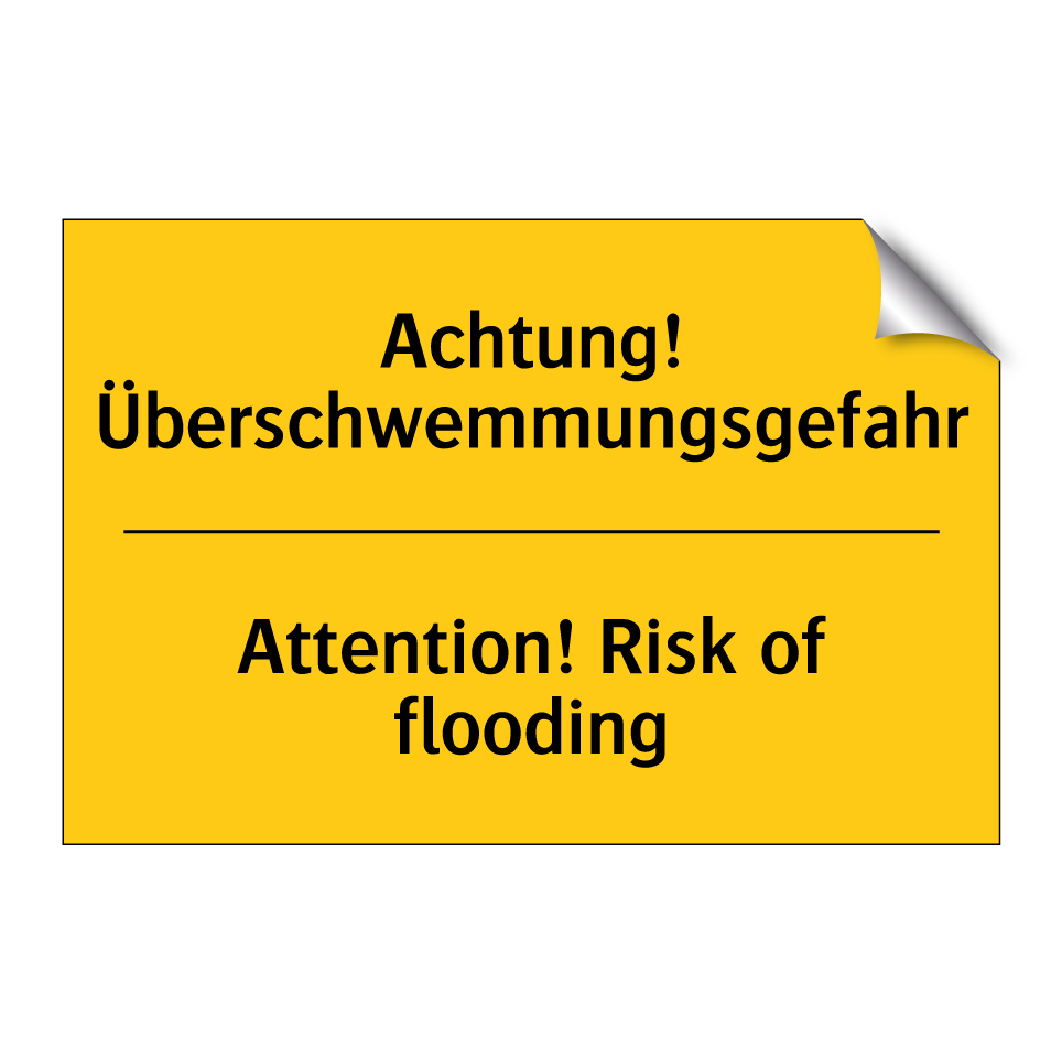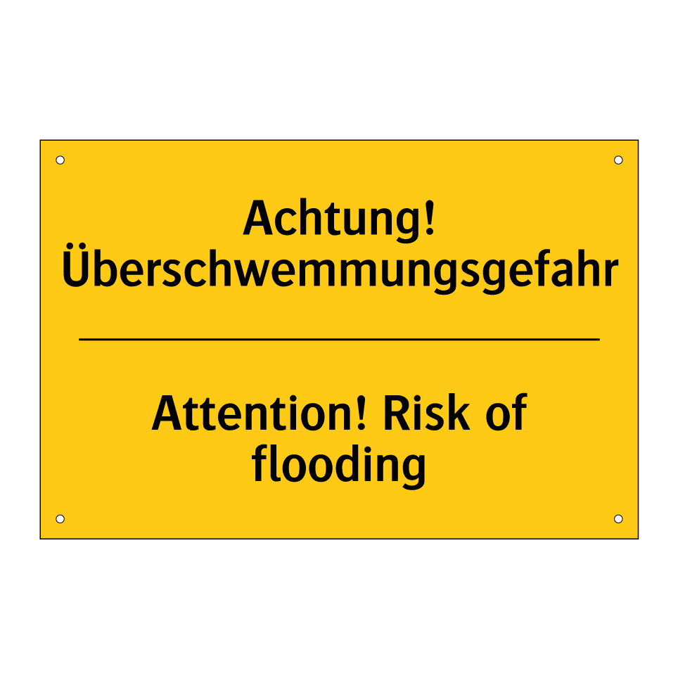 Zweisprachiges Warnschild mit deutschem Text Achtung! Überschwemmungsgefahr und englischem Text Attention! Risk of flooding