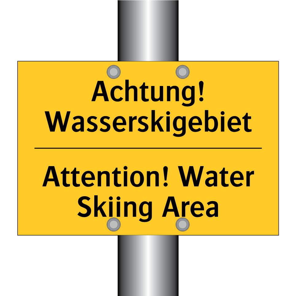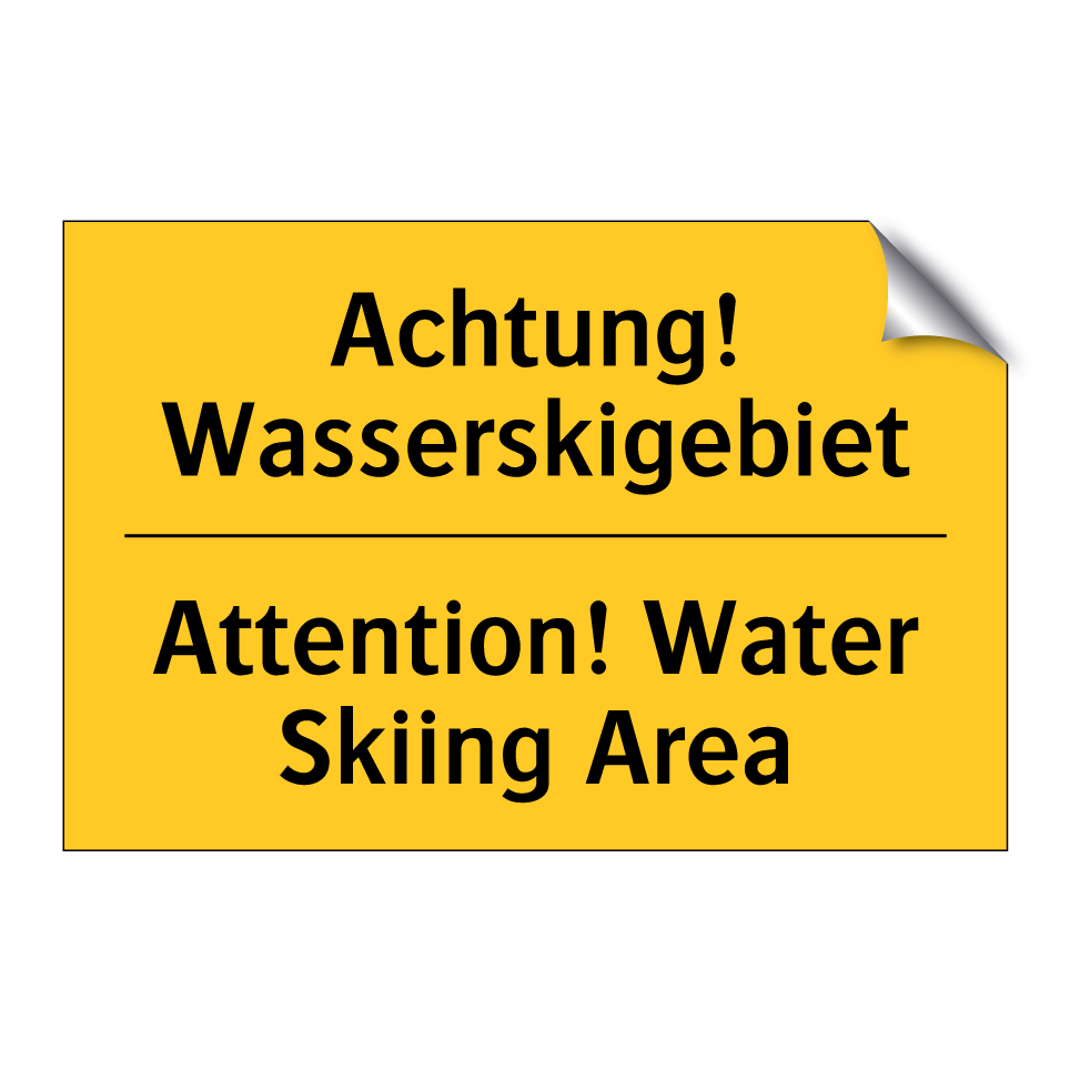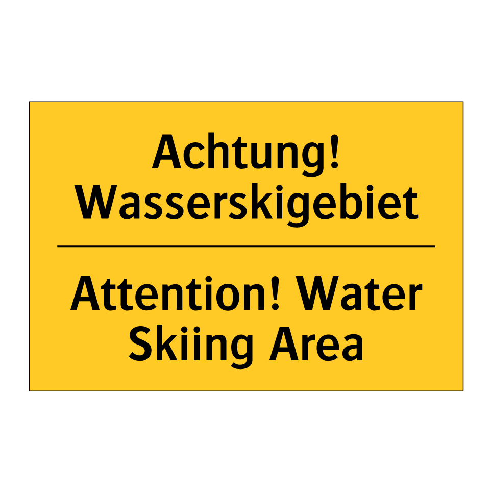 Zweisprachiges Warnschild mit deutschem Text Achtung! Wasserskigebiet und englischem Text Attention! Water Skiing Area