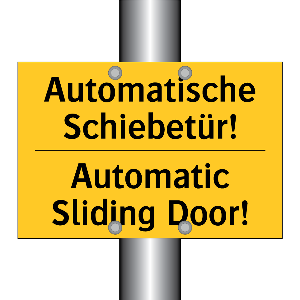 Zweisprachiges Warnschild mit deutschem Text Automatische Schiebetür! und englischem Text Automatic Sliding Door!