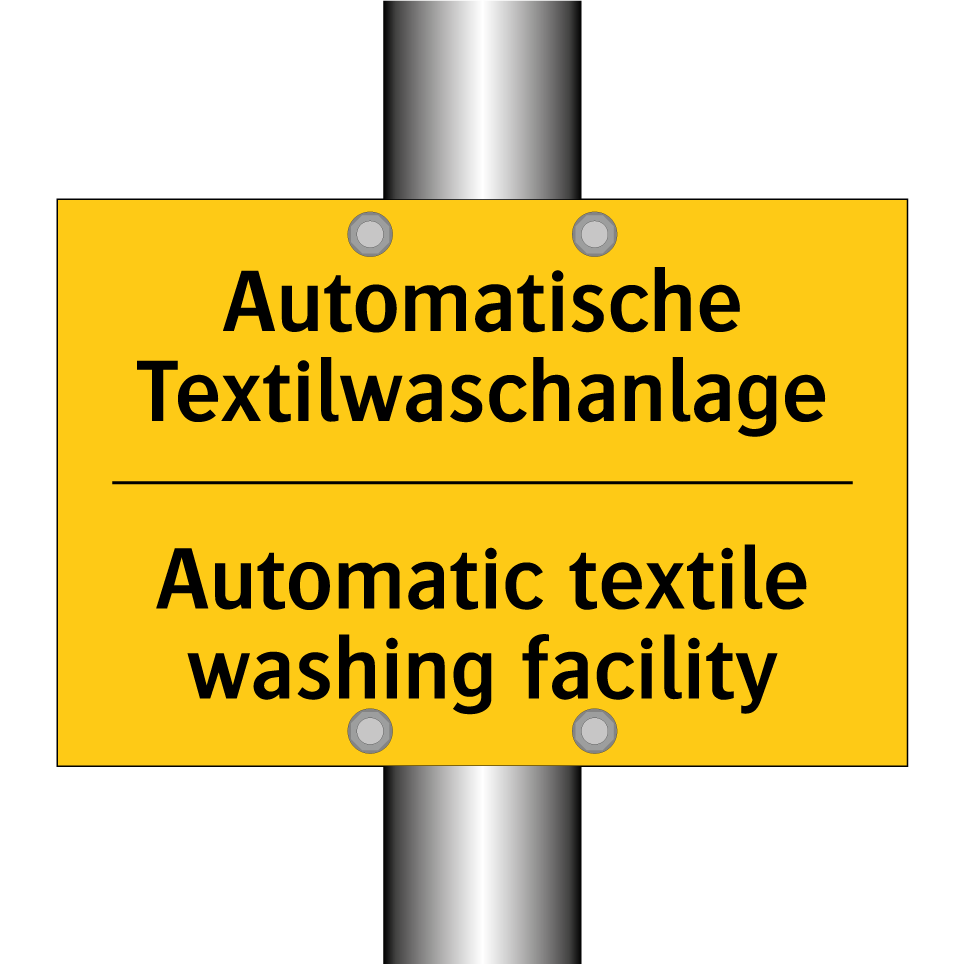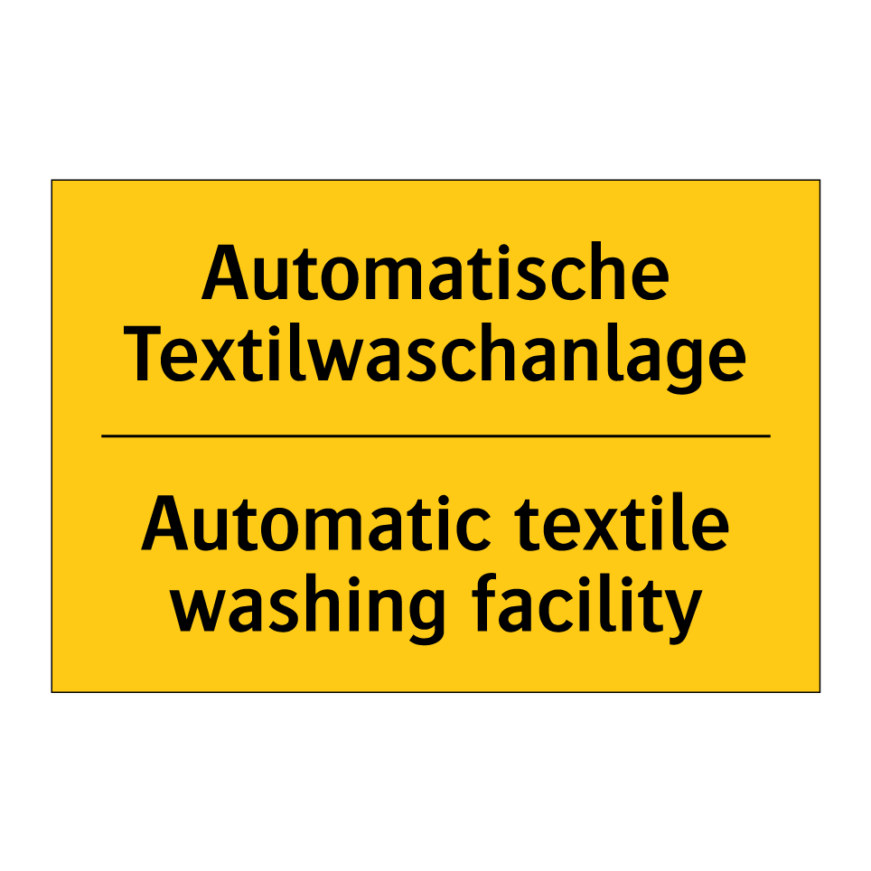 Zweisprachiges Warnschild mit deutschem Text Automatische Textilwaschanlage und englischem Text Automatic textile washing facility