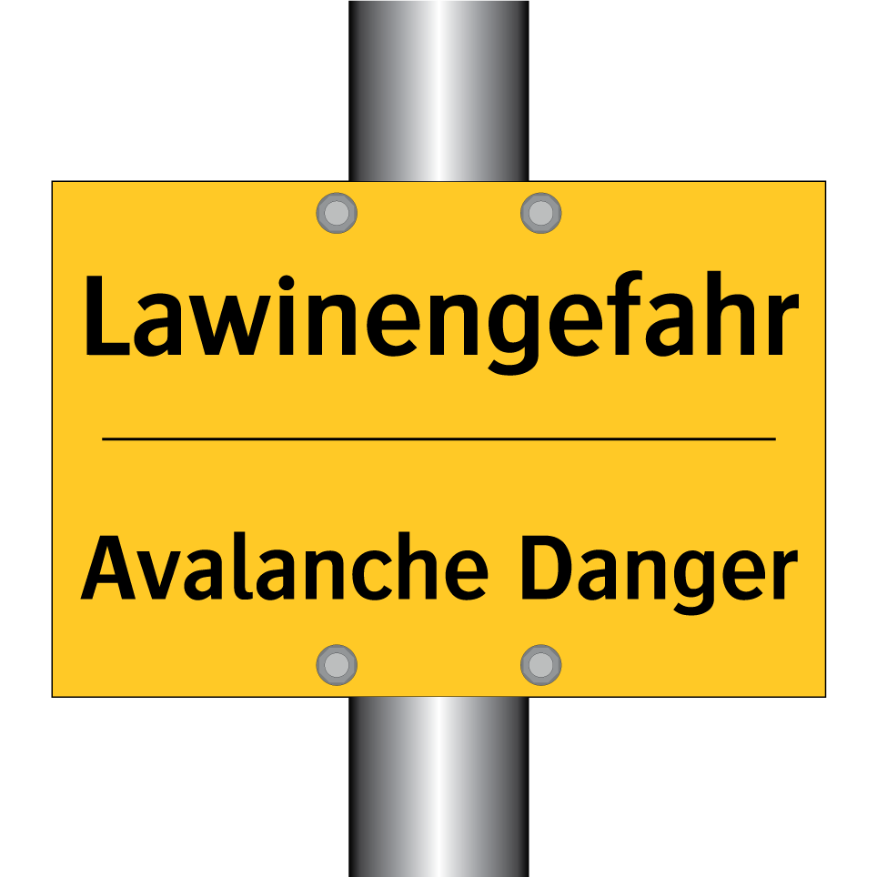 Zweisprachiges Warnschild mit deutschem Text Lawinengefahr und englischem Text Avalanche Danger