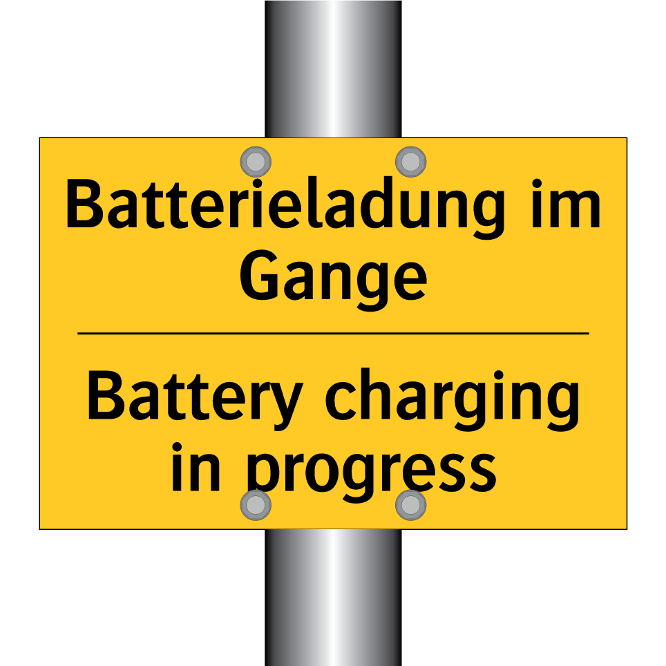 Zweisprachiges Warnschild mit deutschem Text Batterieladung im Gange und englischem Text Battery charging in progress