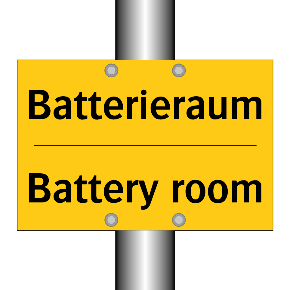 Zweisprachiges Warnschild mit deutschem Text Batterieraum und englischem Text Battery room